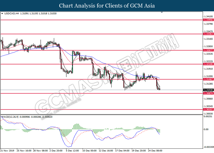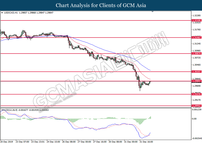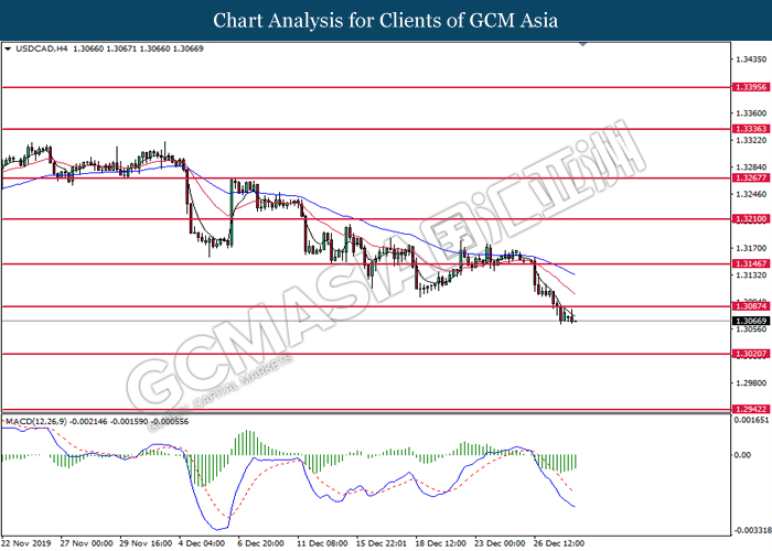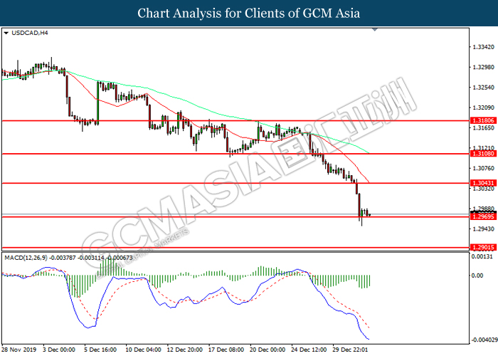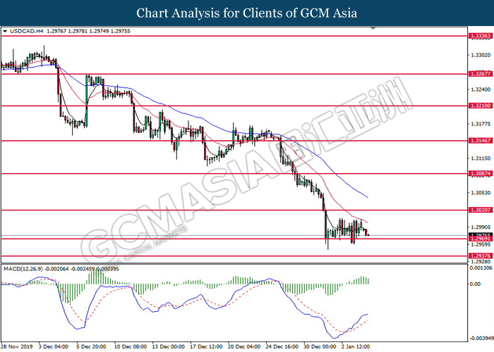 USDCAD, H4: USDCAD was traded lower while currently testing the support level at 1.2970. MACD which illustrated diminishing bullish momentum suggest the pair to be traded lower after it successfully breakout below the support level at 1.2970.