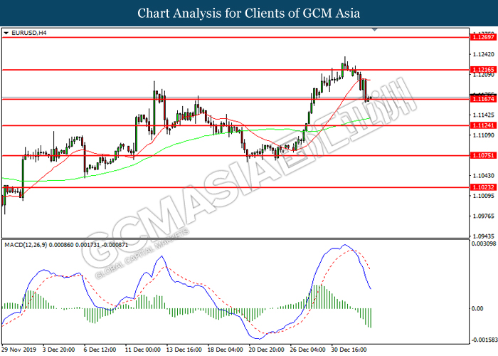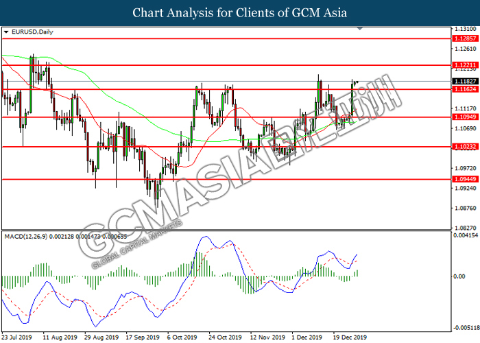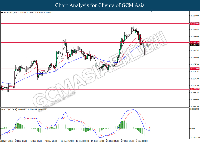 EURUSD, H4: EURUSD was traded higher while currently testing the resistance level at 1.1170. MACD which illustrated diminishing bearish momentum suggest the pair to extend its gains after it successfully breakout above the resistance level at 1.1170.