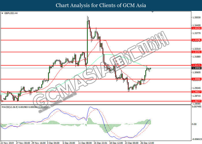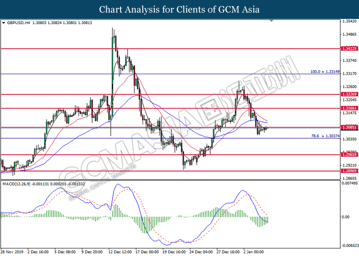 GBPUSD, H4: GBPUSD was traded higher while currently testing the resistance level at 1.3085. MACD which illustrated diminishing bearish momentum suggest the pair to extend its gains after it successfully breakout above the resistance level at 1.3085.