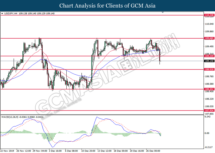USDJPY, Daily: USDJPY was traded lower following prior retracement from the resistance level at 109.70. MACD which illustrated diminishing bullish momentum suggest the pair to extend its losses toward the support level at 109.25.