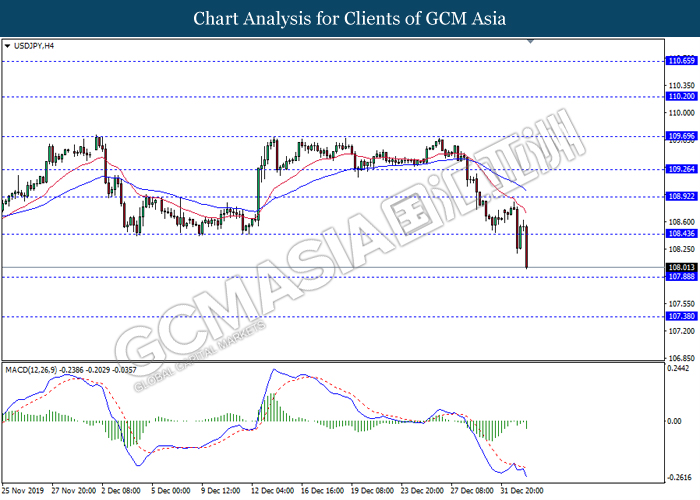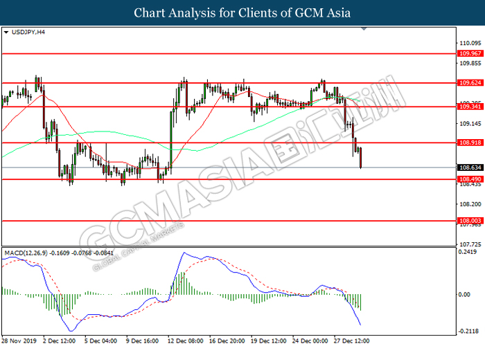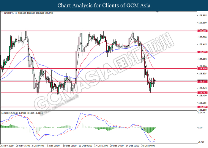 Japanese Yen slumped on Tuesday amid easing trade tension between U.S and China, which stocked a shift in sentiment toward riskier asset while dragged down the appeal of Japanese Yen. According to Reuters, U.S. President Donald Trump claimed on Tuesday that he and Chinese President Xi Jinping will have a signing ceremony to sign the first phase of the U.S.-China trade deal within this month. In fact, Chinese Foreign Ministry spokesman Geng Shuang also reiterated on yesterday that both countries were having a very good negotiation between each other. However, Beijing has not yet confirmed any specific components with regards of the trade deal that were released by U.S. officials. At this time, investors would still continue to scrutinize any updates with regards of the “phase one” trade deal in order to gauge the likelihood movement for the safe-haven until the trade deal is completely signed. As of writing, USD/JPY appreciated by 0.02% to 109.36. On the other hand, the dollar index was traded flat at 97.62 with markets subdued by the holiday break.