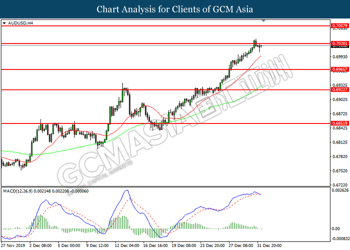 AUDUSD, H4: AUDUSD was traded higher while currently testing the resistance level at 0.6930. However, MACD which illustrate diminishing bullish momentum suggest the pair to be traded lower in short-term as technical correction.