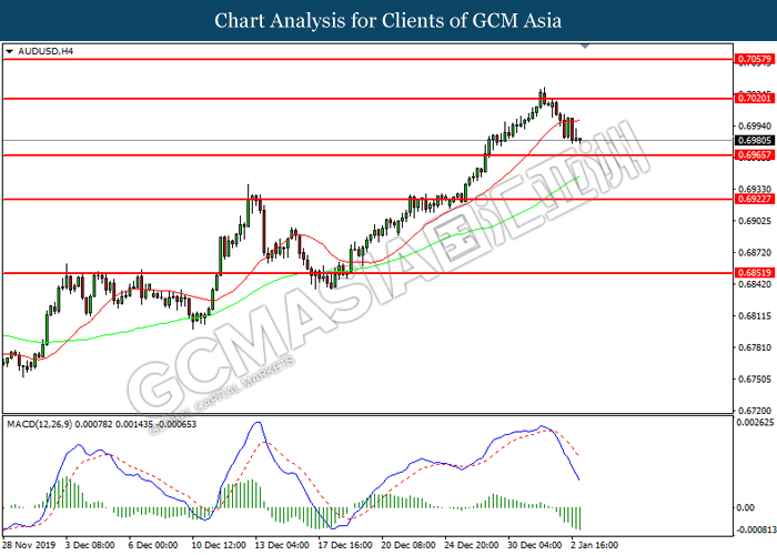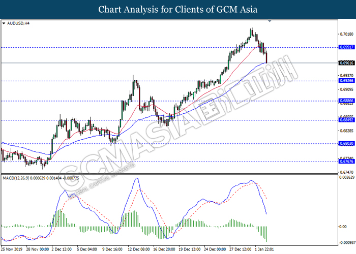 AUDUSD, H4: AUDUSD was traded lower following prior retracement from the resistance level 0.6990. MACD which display persistent bearish momentum signal suggest the pair to extend its retracement towards the support level 0.6925.