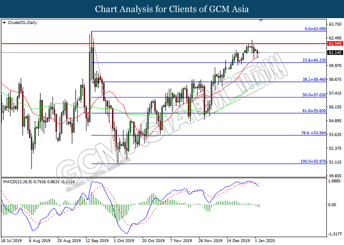 In commodities market, crude oil prices skyrocketed 2.91% to $63.00 per barrel following heightening of geopolitical tensions in Middle East. This round of air strike has escalated the market worries over the disruption of crude oil production in Iran, subsequently reduce the global oil supply. Besides, gold prices rose 0.76% to $1540.20 a troy ounce amid the death of Iranian general Qassem lifted up the market’s risk avoidance sentiment.
