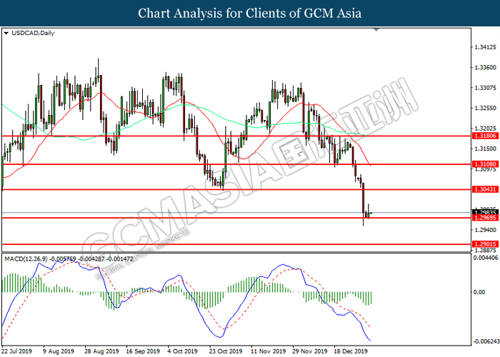 GBPUSD, Daily: GBPUSD was traded lower following prior breakout below the previous support level at 1.2985. MACD which illustrated increasing bearish momentum suggest the pair to extend its losses toward support level at 1.2795.