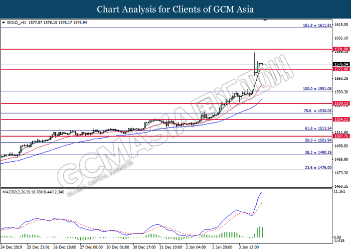 GOLD_, H1: Gold price was traded higher following prior breakout above the previous resistance level at 1572.10. However, MACD which illustrated diminishing bullish momentum suggest the commodity to undergo technical correction toward the lower level.