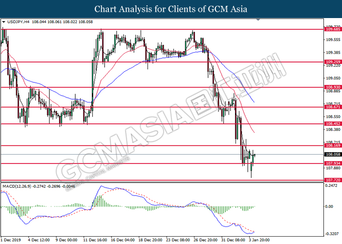 USDJPY, H4: USDJPY was traded lower while currently testing near the support level 107.90. MACD which illustrate persistent bearish bias signal suggest the pair to extend its losses after it breaks below the support level.