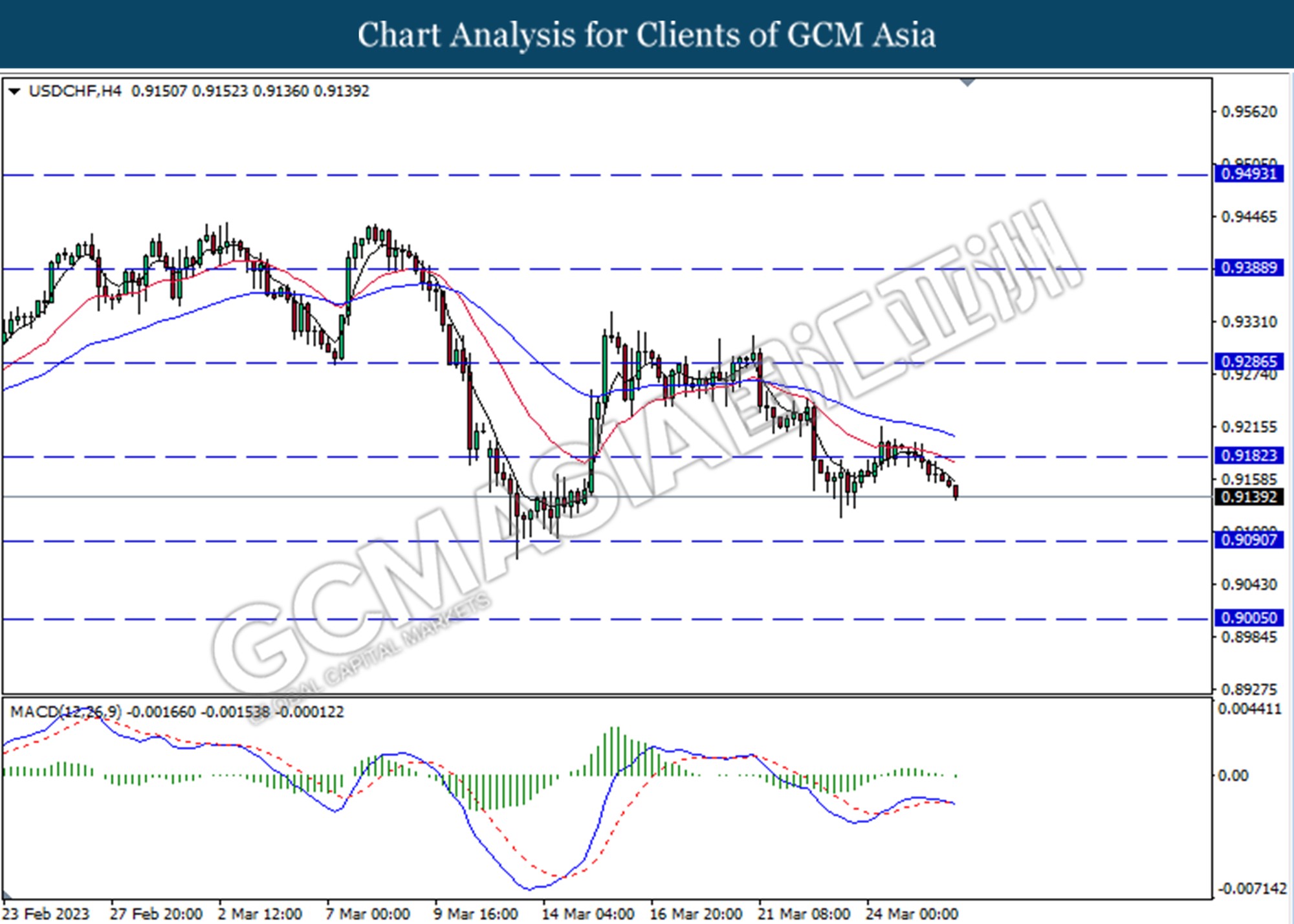 USDCHF, H4: USDCHF was traded lower following the prior break below from the previous support level at 0.9180. MACD which illustrated bearish momentum suggests the pair to extend its losses toward the support level at 0.9090.