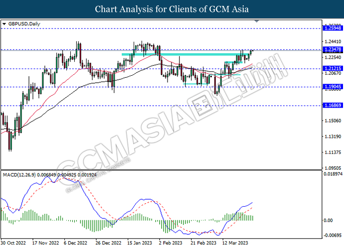 GBPUSD, Daily: GBPUSD was traded higher while currently testing the resistance level at 1.2425. MACD which illustrated bullish bias momentum suggest the pair to extend its gains after it successfully breakout above the resistance level.