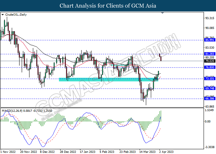 CrudeOIL, H4: Crude oil price was traded lower following a prior retracement from the higher level. However, MACD which illustrated increasing bullish momentum suggests the commodity to undergo technical correction in the short term.
