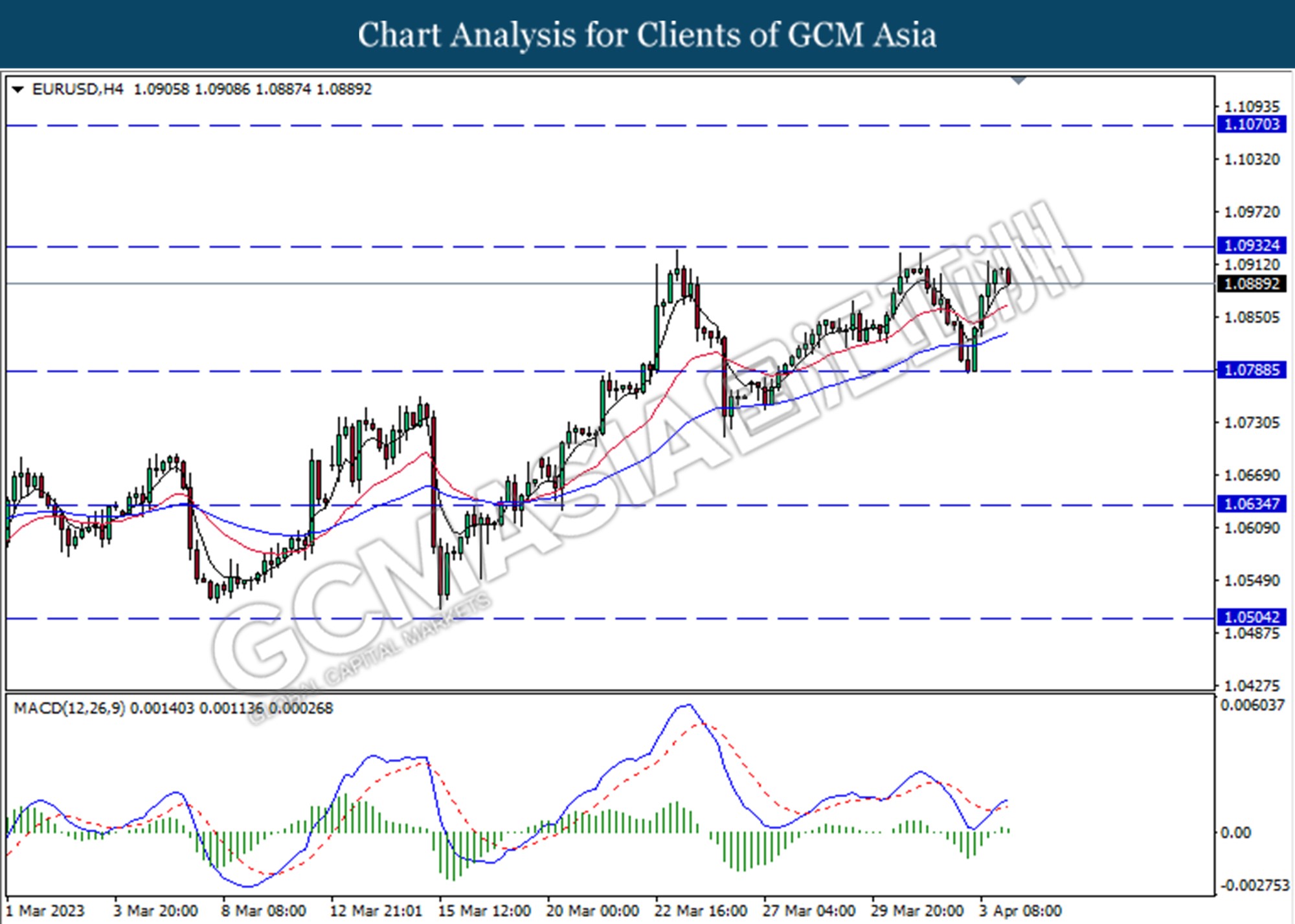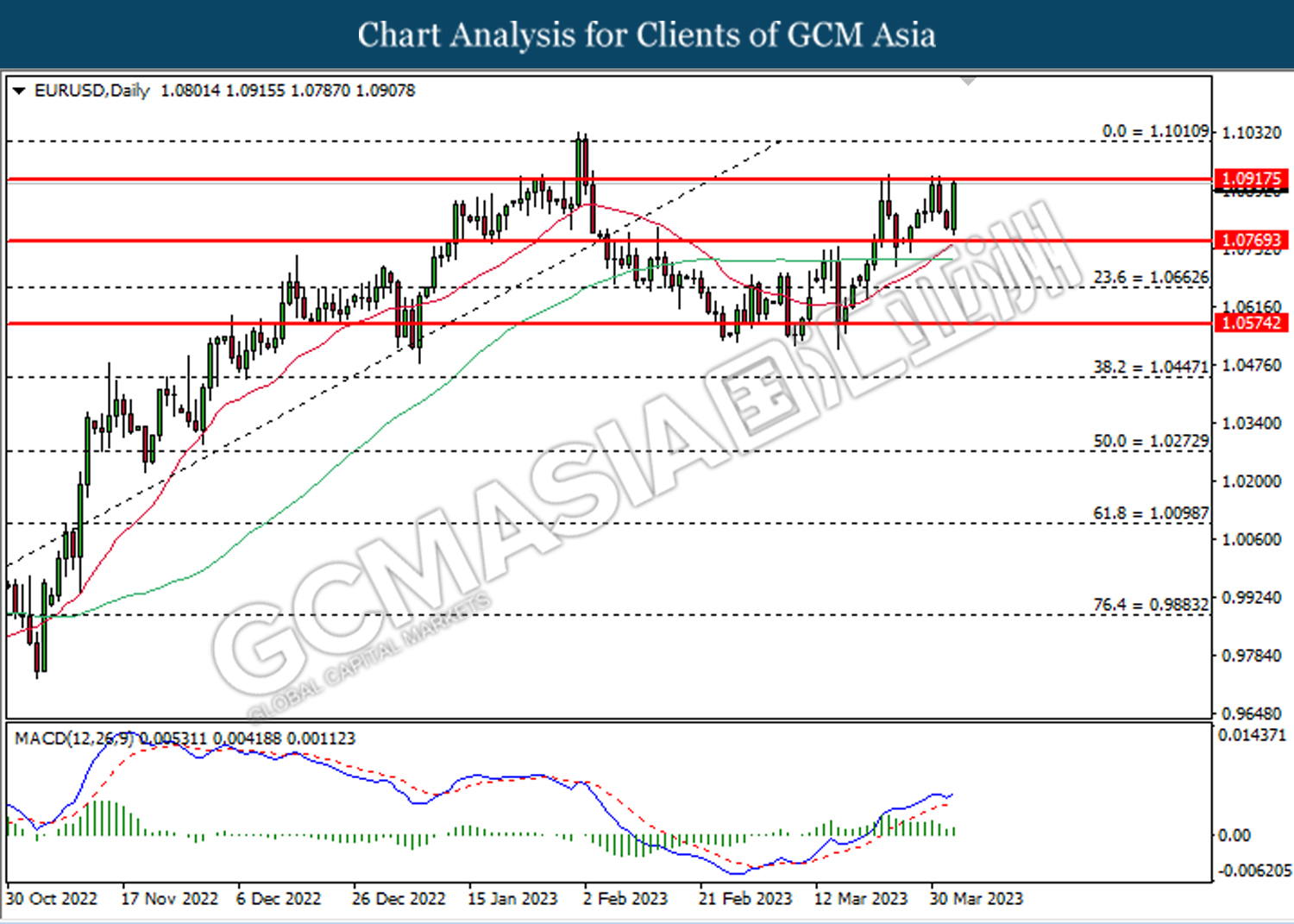 EURUSD, Daily: EURUSD was traded higher while currently testing the resistance level at 1.0915 MACD which illustrated bullish momentum suggest the pair to extend its gains after it successfully breakout above the resistance level.