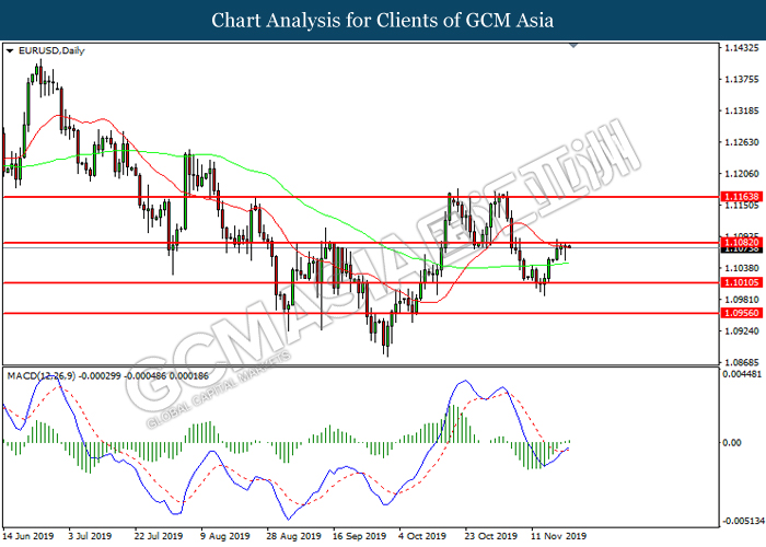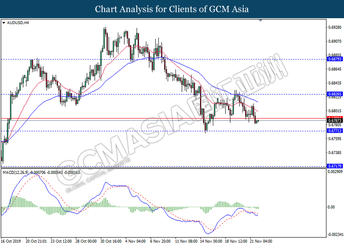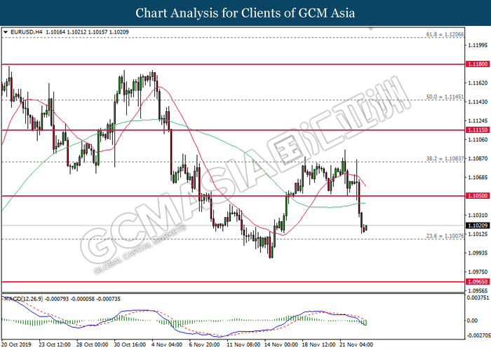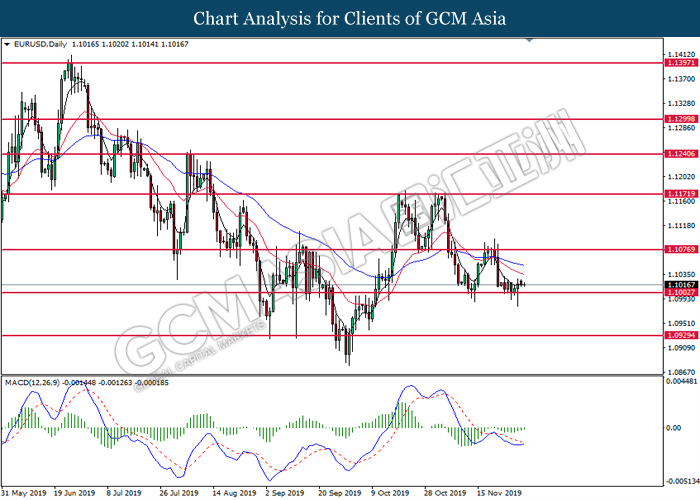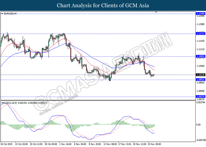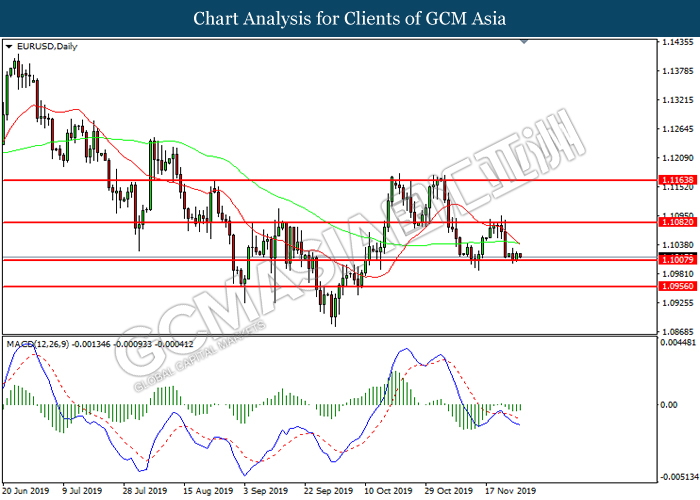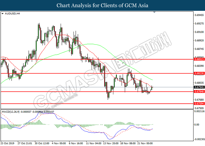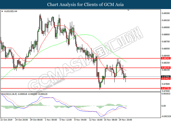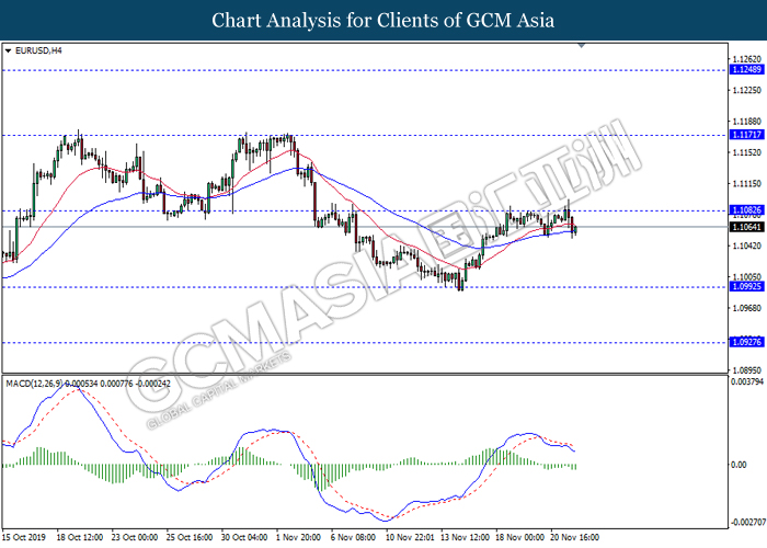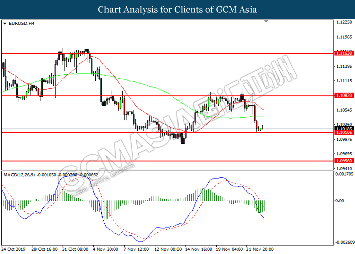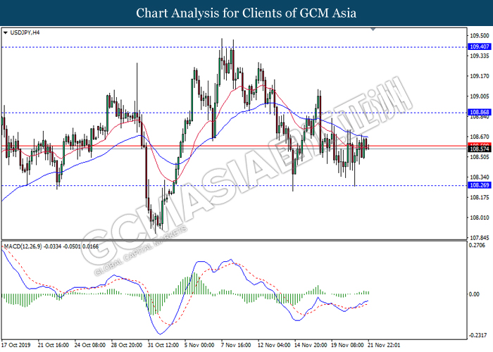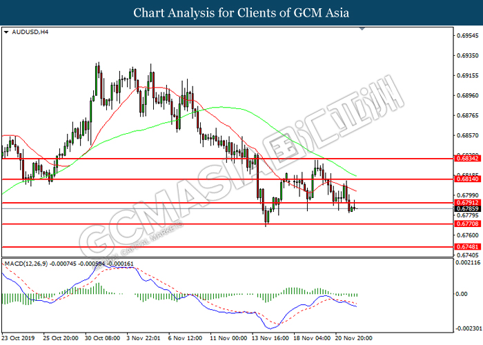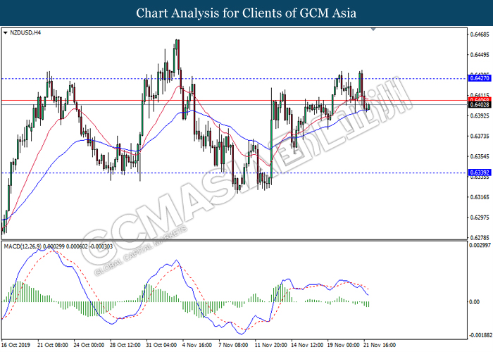 Dollar index which gauge its value against a basket of six major currencies fall as US global trade issue continues to weigh on this single currency market’s sentiment. Last week, the window for auto related tariffs on EU had closed as US President Donald Trump was supposed to make a final decision before the deadline 14th November. After the deadline passed, recent news show that US administration official are now considering whether to start another round of trade investigation against EU, but even much broader trade inquiry for this time. Moreover, trade talk between US and China remains deadlock as China emphasized that they will continue to eye on US next move with regards to backing Hong Kong Bill. Prior, China reacted angrily toward Washington’s proposal over Hong Kong issue as US is interfering the internal affairs between China and Hong Kong, and it became another obstacle to the phase 1 trade deal between these both parties. Adding further anger on Chinese government is US President Trump is not considering to veto the bill, showing no willingness to close a deal with them. As of writing, dollar index inched down 0.05% to 97.95.