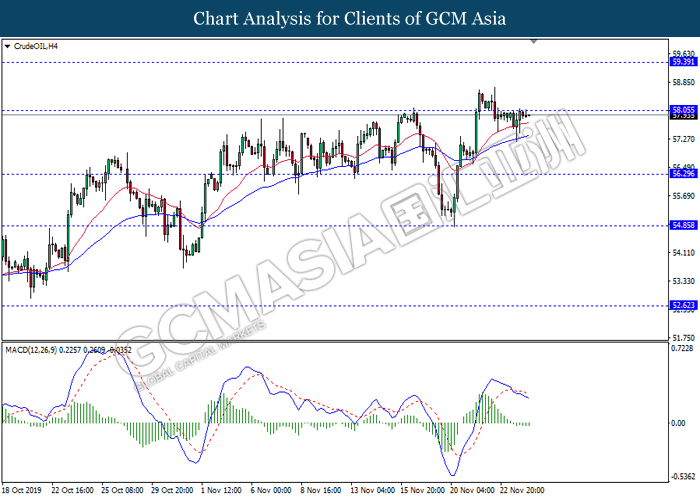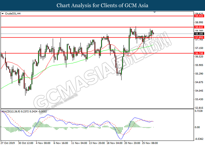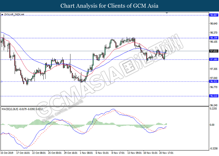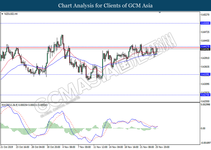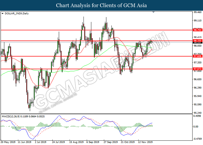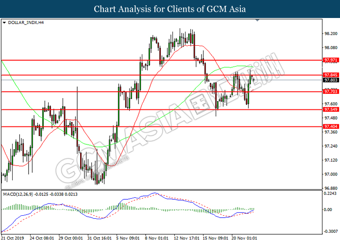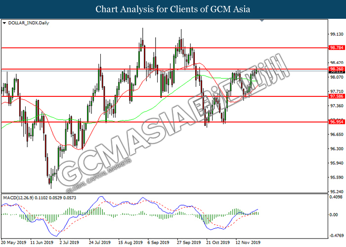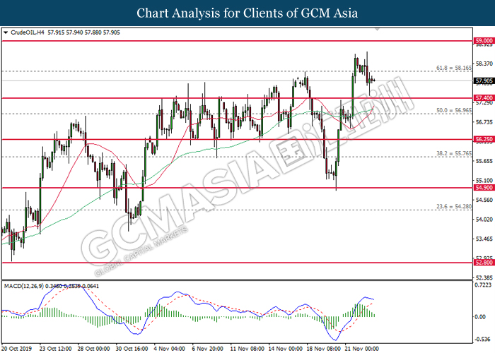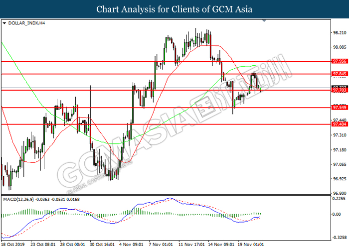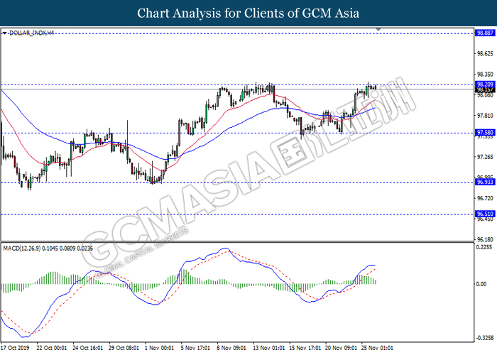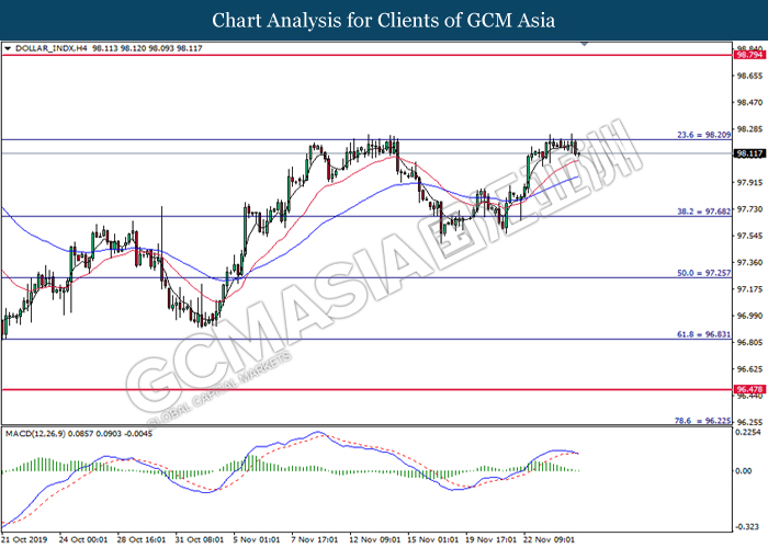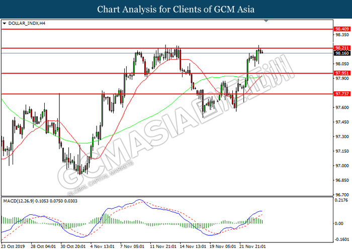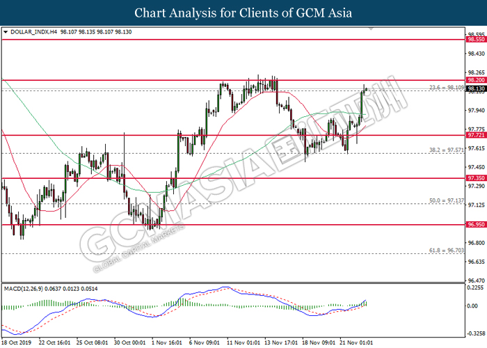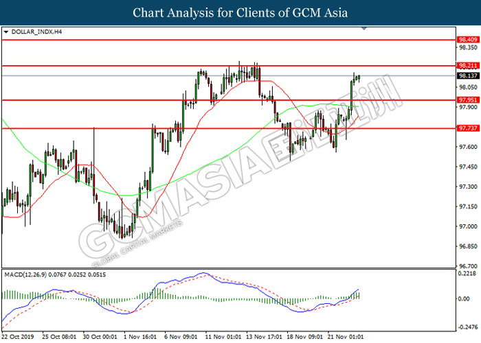 Dollar index which measured against a basket of six major currency pairs continue to holding its high ground during late Asian trading session as market scale back their rate cut expectation. Despite recent headlines in trade development between U.S and China, investors remain firm as recent data suggest the economy in U.S remain in a strong footing. Besides that, Fed also recently hinted an upbeat outlook following stronger labor market and a possible turnaround in business investment, thus prompting investors to continue holding their bets of the greenback. As market are expected to be thinly traded due to Thanksgiving Holiday, investors will be waiting for further catalyst to determine the sentiment for the greenback. As of writing, dollar index edge higher 0.02% to 98.20.