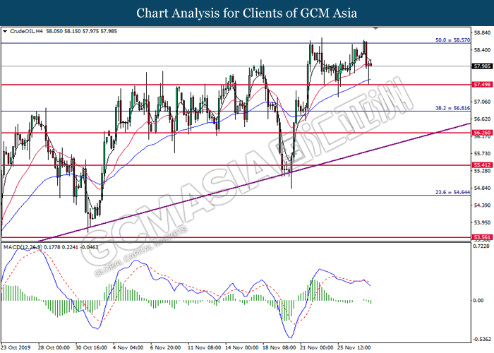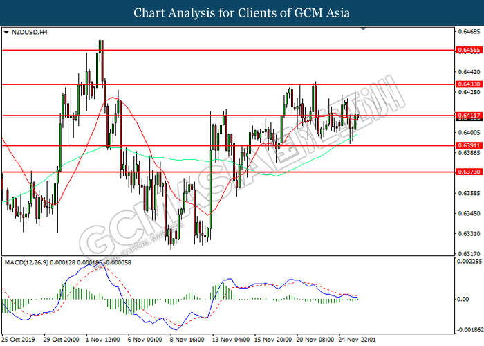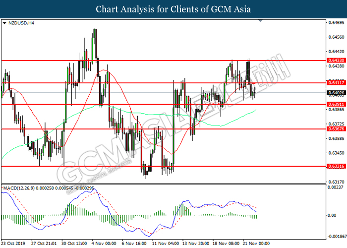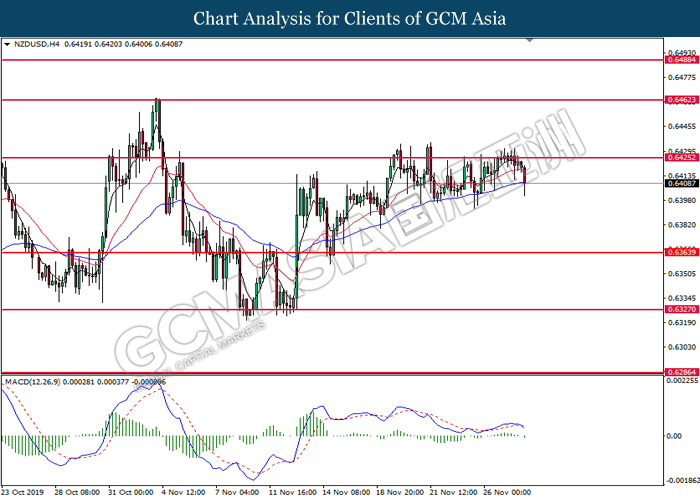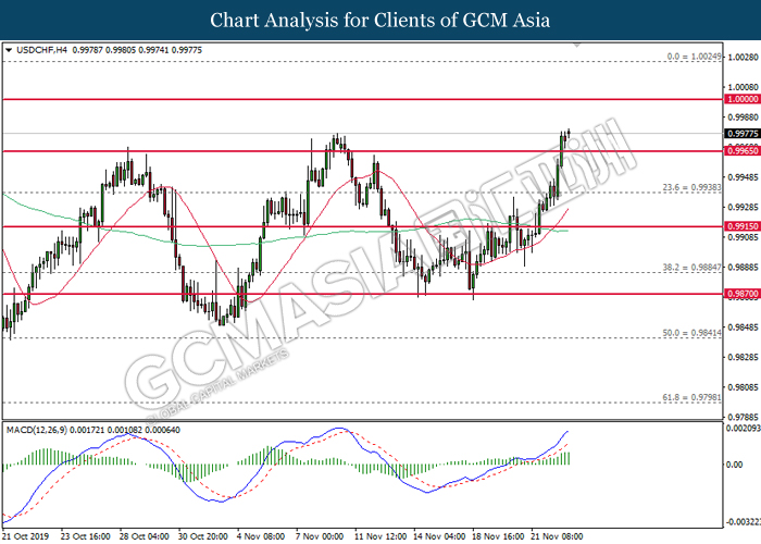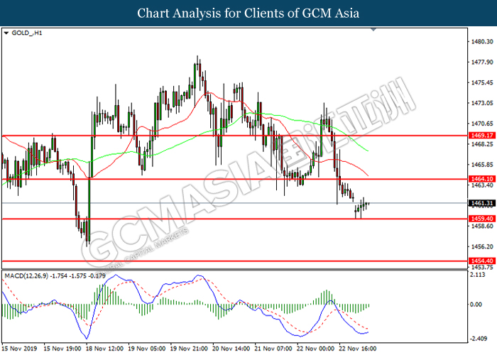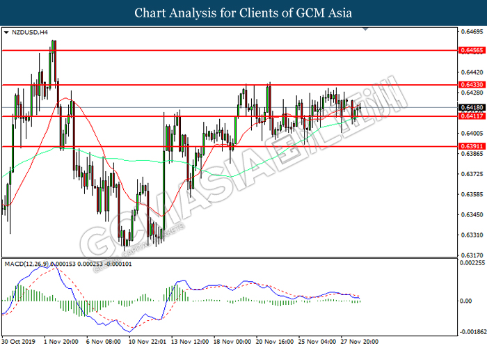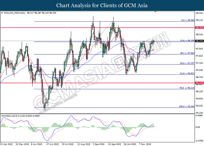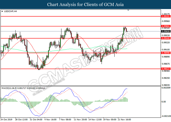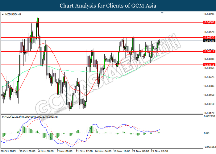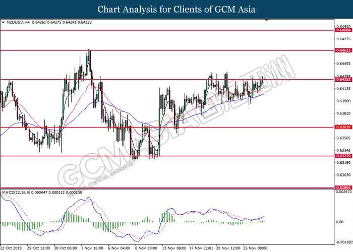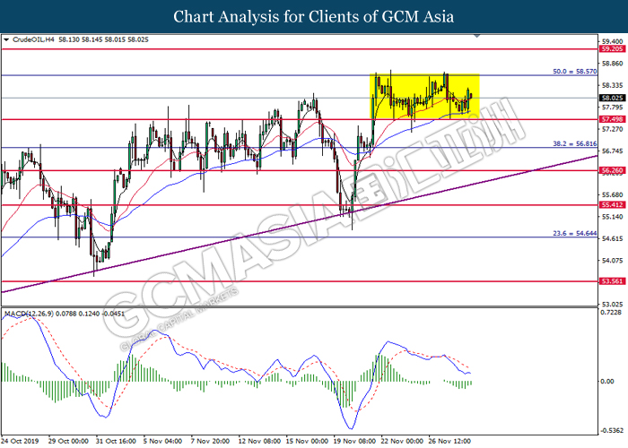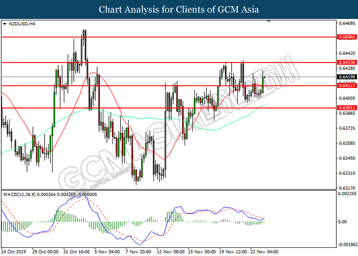 Dollar index which measured against a basket of six major currency pairs continue to holding its high ground during late Asian trading session as market scale back their rate cut expectation. Despite recent headlines in trade development between U.S and China, investors remain firm as recent data suggest the economy in U.S remain in a strong footing. Besides that, Fed also recently hinted an upbeat outlook following stronger labor market and a possible turnaround in business investment, thus prompting investors to continue holding their bets of the greenback. As market are expected to be thinly traded due to Thanksgiving Holiday, investors will be waiting for further catalyst to determine the sentiment for the greenback. As of writing, dollar index edge higher 0.02% to 98.20.