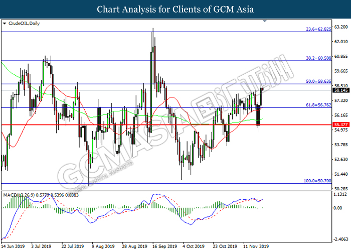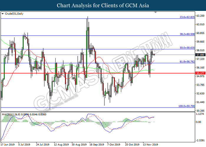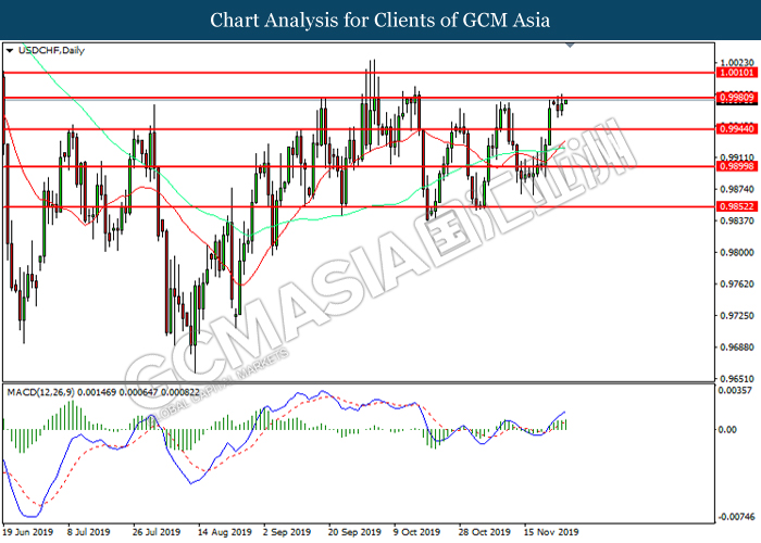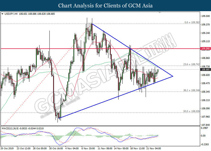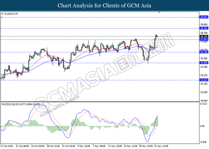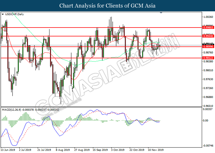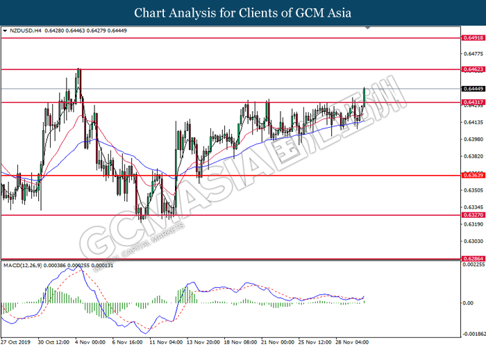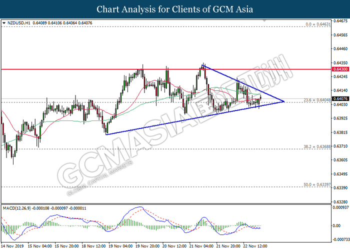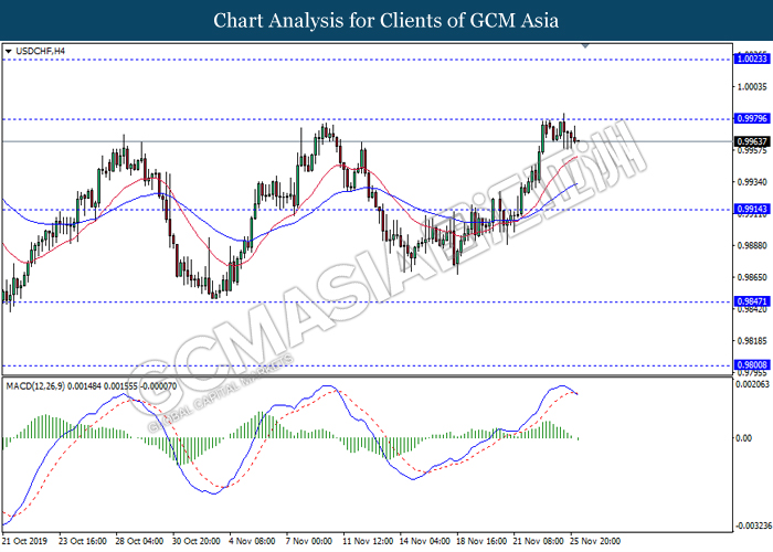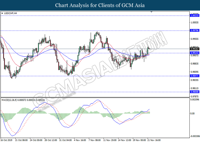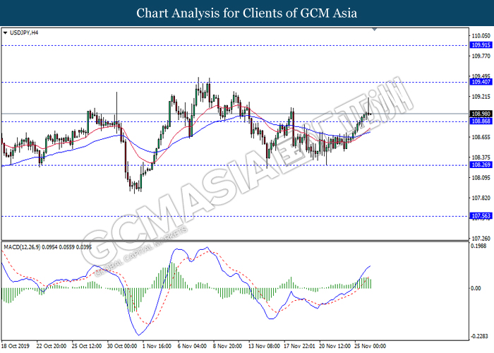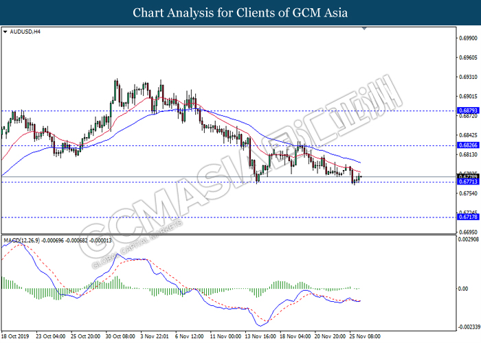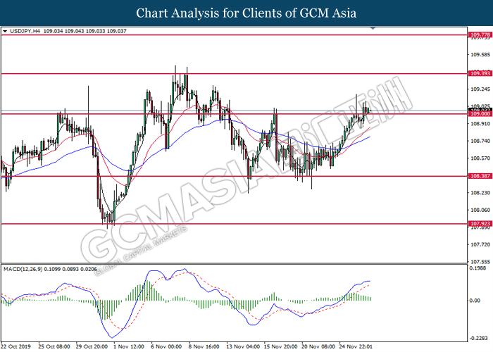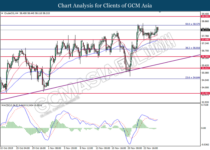 Dollar index which measured against a basket of six major currency pairs continue to holding its high ground during late Asian trading session as market scale back their rate cut expectation. Despite recent headlines in trade development between U.S and China, investors remain firm as recent data suggest the economy in U.S remain in a strong footing. Besides that, Fed also recently hinted an upbeat outlook following stronger labor market and a possible turnaround in business investment, thus prompting investors to continue holding their bets of the greenback. As market are expected to be thinly traded due to Thanksgiving Holiday, investors will be waiting for further catalyst to determine the sentiment for the greenback. As of writing, dollar index edge higher 0.02% to 98.20.