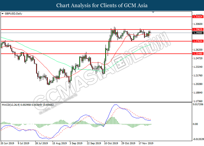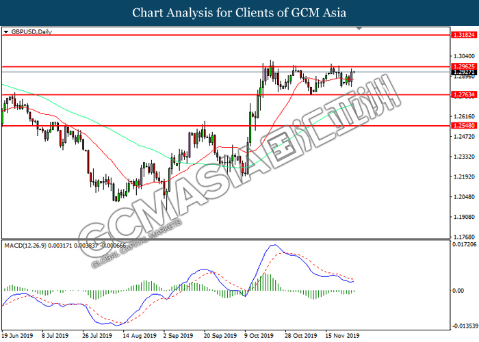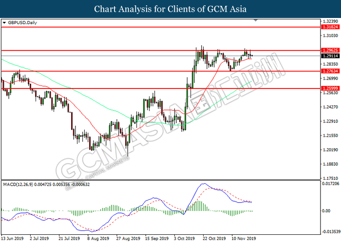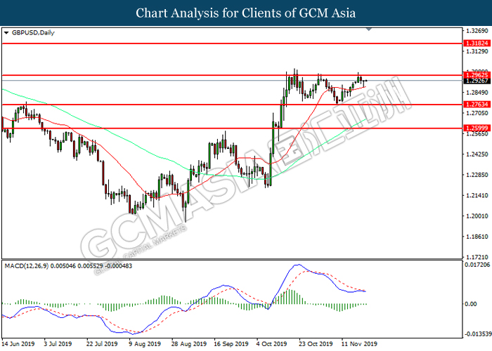 GBPUSD, Daily: GBPUSD was traded higher while currently testing the resistance level at 1.2965. MACD which illustrated diminishing bearish momentum suggest the pair to extend its gains after it successfully breakout above the resistance level.