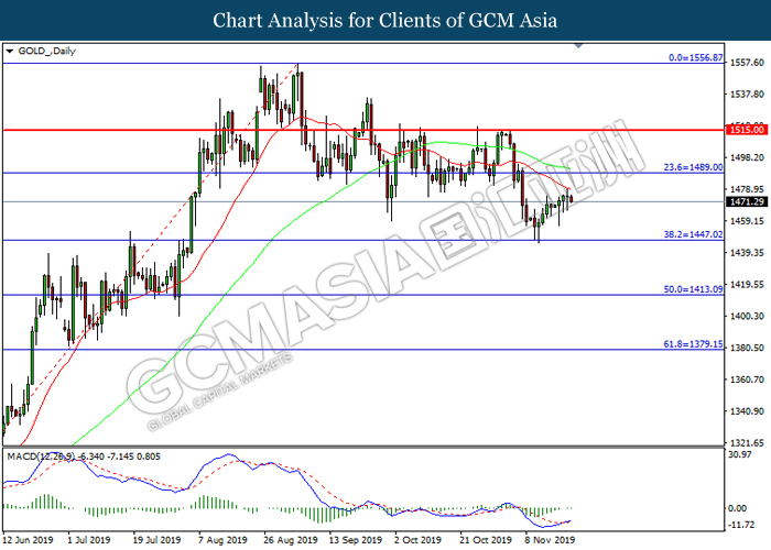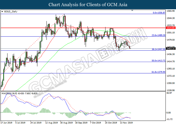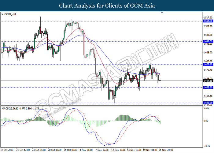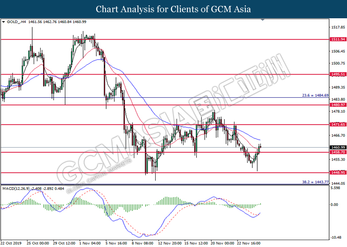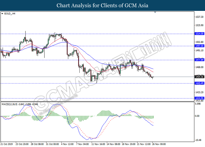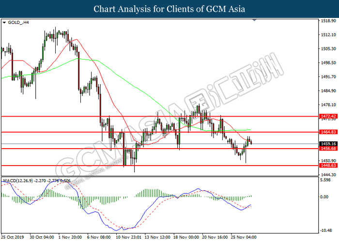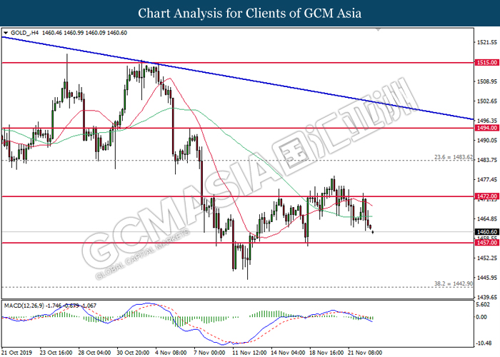 GOLD_, H4: Gold price was traded lower following prior retrace from its higher levels. MACD which illustrate bearish signal suggests its price to be traded lower, towards the direction of 1457.00.