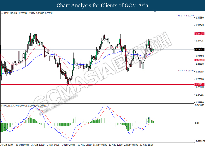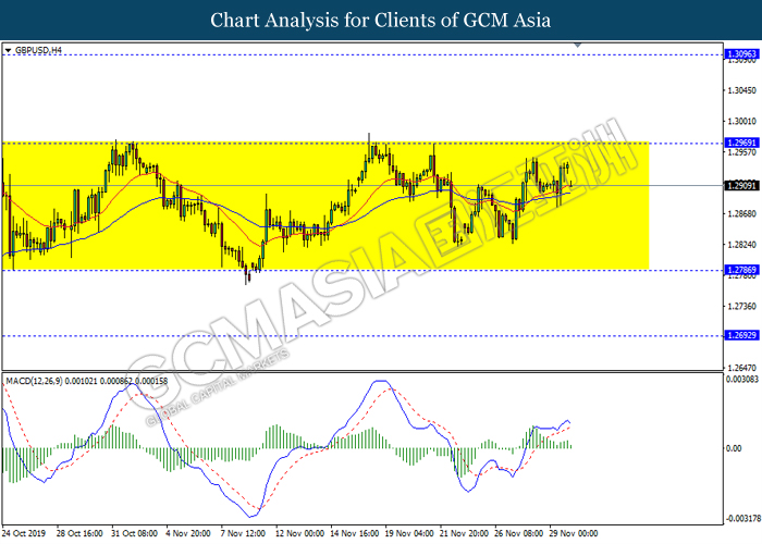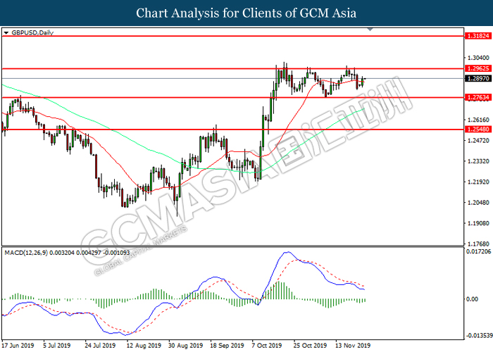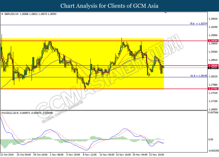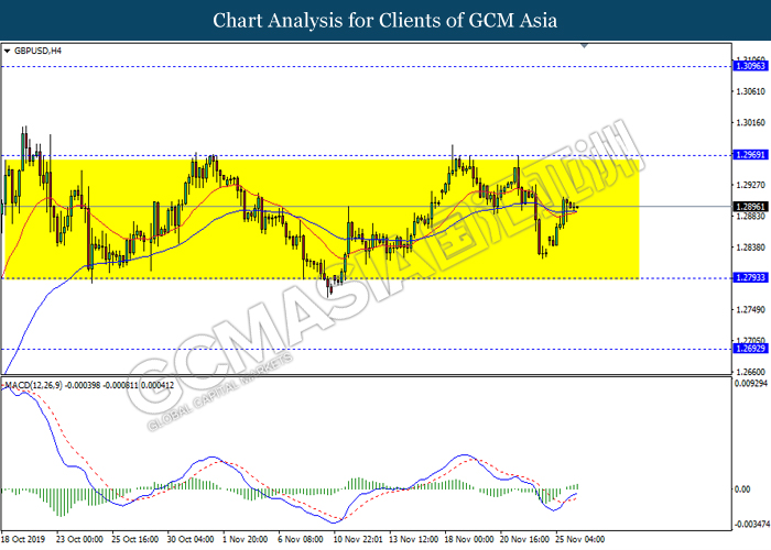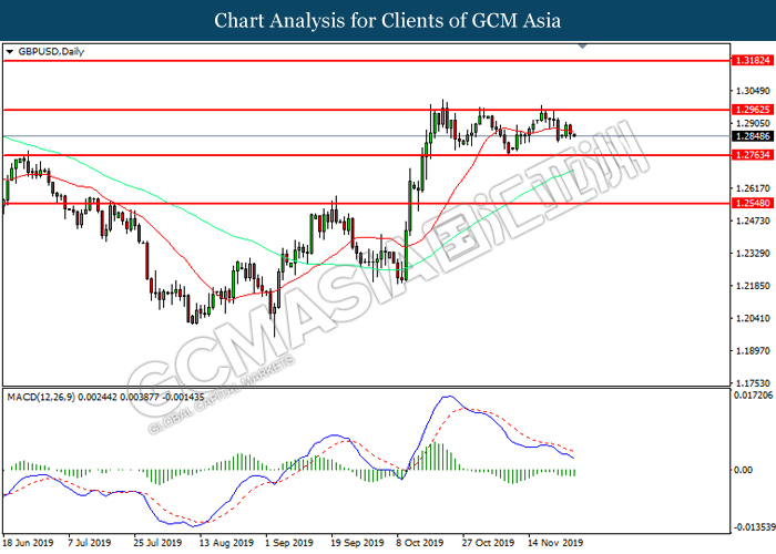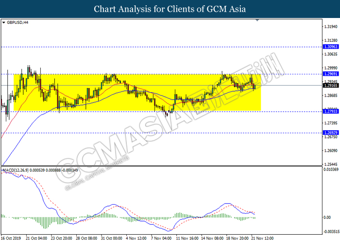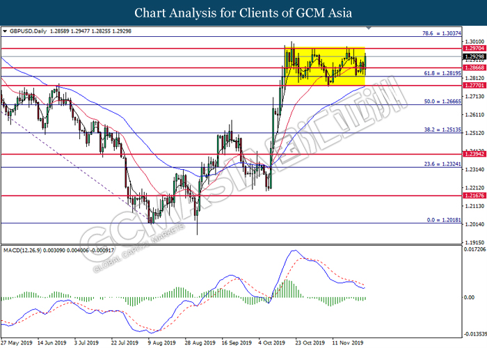 GBPUSD, H4: GBPUSD remain traded in a sideway channel. However, MACD which display diminishing bearish momentum suggest the pair to be traded higher in short term towards the resistance level 1.2970.