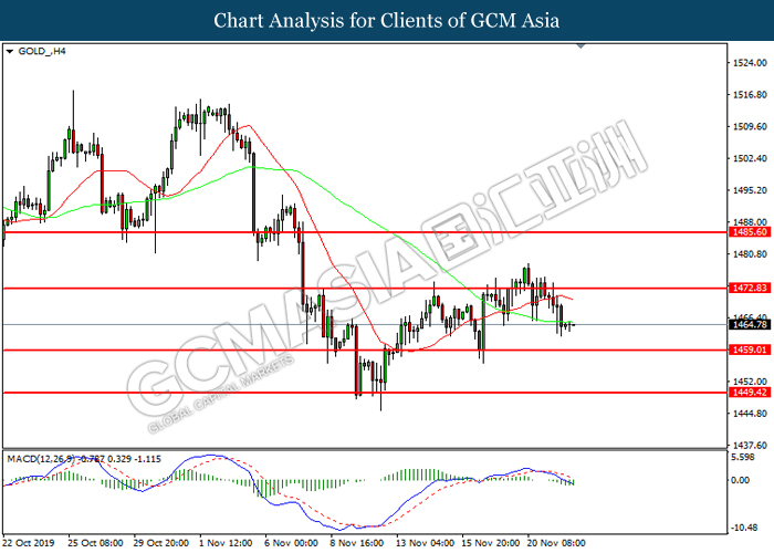 GOLD_ H4: Gold price was traded lower following prior retracement from the resistance level 1472.85. MACD which illustrate increasing bearish momentum suggest the commodity to extend its losses toward support level at 1459.00.