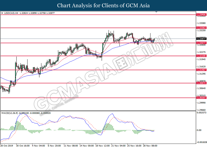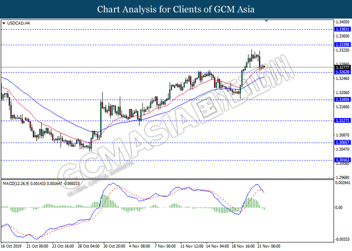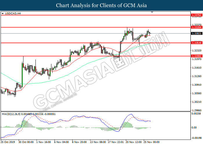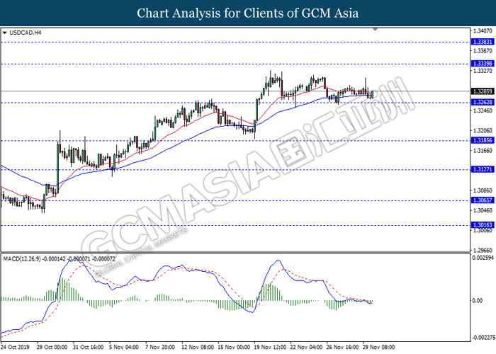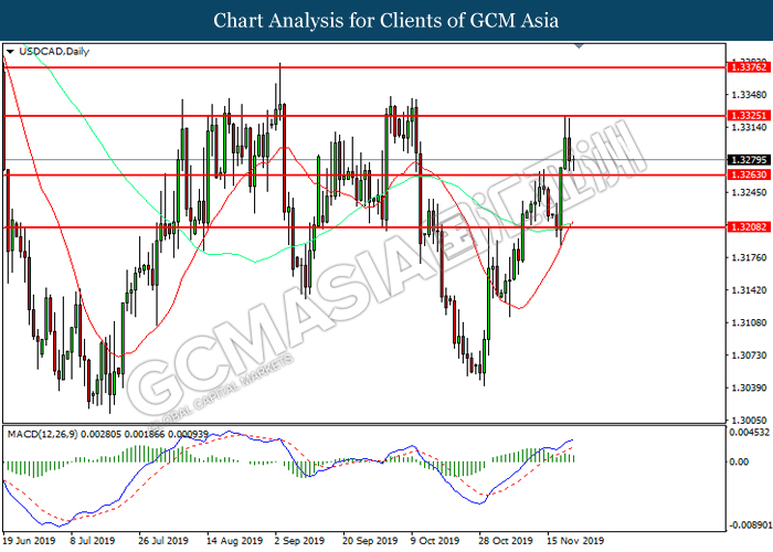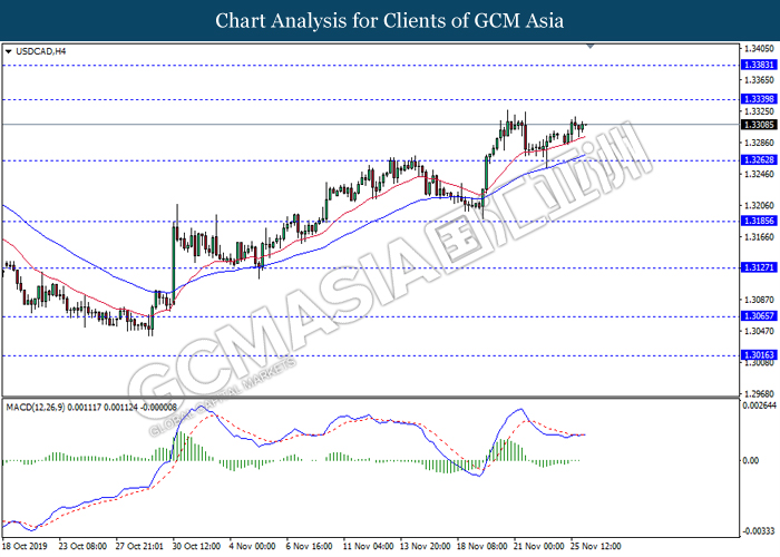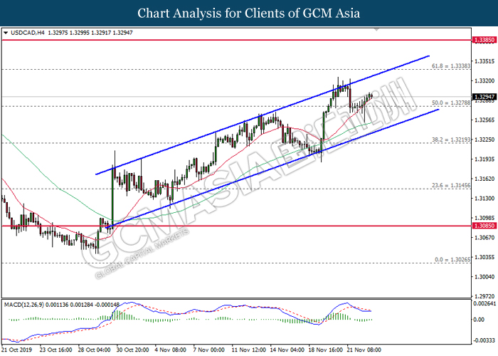 Dollar index which gauge its value against a basket of six major currencies rose up slightly after a gap down following the release of Federal Reserve (Fed) October policy meeting minutes on early today. According the statement, board of Fed mentioned that they see very little need to change the current monetary policy as the last month rate cut from 1.00% to 0.75% is sufficient to support the economy grow in moderate pace and closer to inflation target rate at 2%. If there is no material changes in economy outlook, the policy will likely remain unchanged for an extended period, said by Fed. However, development of trade war between US and China also will be continuously eyed by the committee members from time to time as any changes on that would definitely causes significant consequences toward the US and also global economy. Moreover, the losses of greenback were limited following representative from both countries commented that they are remain optimistic toward the phase 1 trade deal while negotiation is continuing. As of writing, dollar index rose inched down 97.85. On the other hand, the pair of USD/CAD quoted down 0.01% to 1.3305 amid Core CPI data showed a reading of 0.4%, stronger than previous reading at 0.0%. This data indicating that Canada consumer purchasing behavior has strengthened and inflation pressure seemingly moving closer to the target.