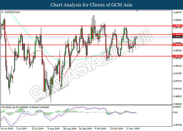 USDCHF, Daily: USDCHF was traded higher following prior breakout above the previous resistance level 0.9900. MACD which illustrate diminishing bearish momentum suggest the pair to extend its gains toward resistance level at 0.9945.