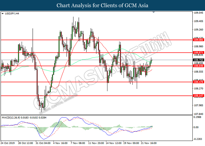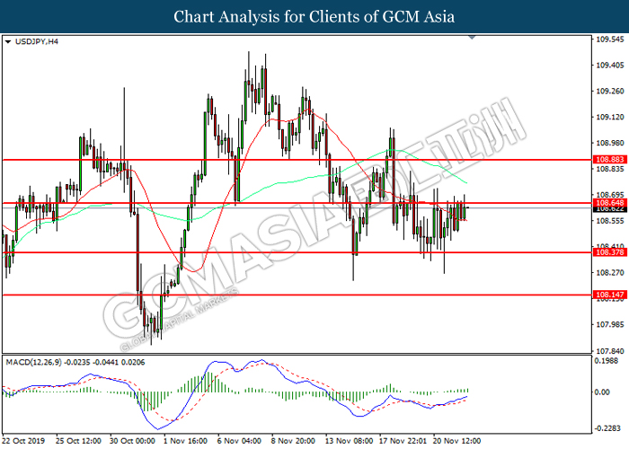 USDJPY, H4: USDJPY was traded higher while currently testing the resistance level at 108.65. MACD which illustrated increasing bullish momentum suggest the pair to extend its gains after it successfully breakout above the resistance level.