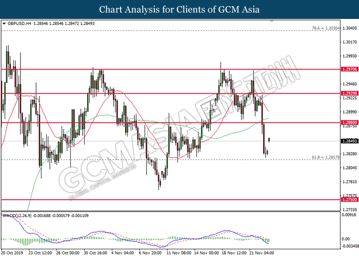 GBPUSD, H4: GBPUSD remain traded in a sideway channel following recent retracement from its high level. However, MACD which illustrate diminishing bullish momentum suggest the pair to be traded lower in short term towards the support level 1.2785.