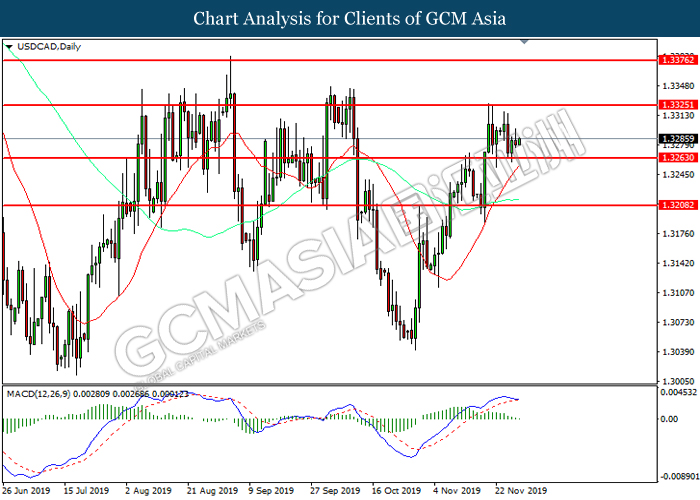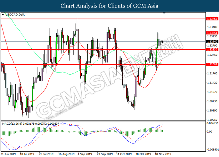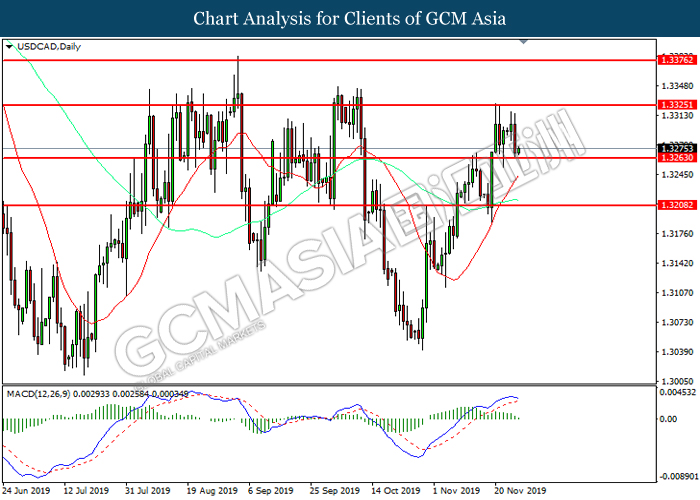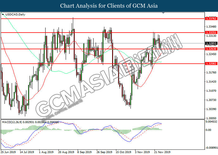 USDCAD, Daily: USDCAD was traded lower following prior retracement from the resistance level at 1.3325. MACD which illustrated diminishing bullish momentum suggest the pair to extend its losses toward support level at 1.3265.