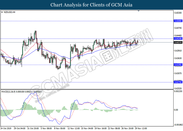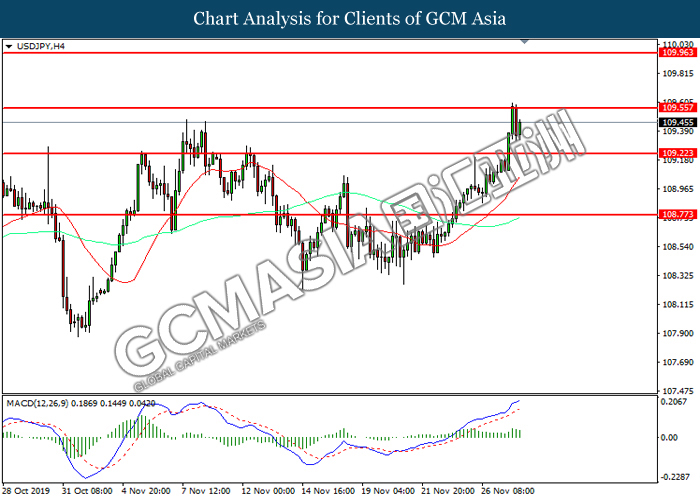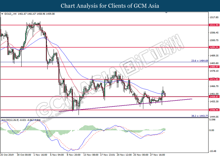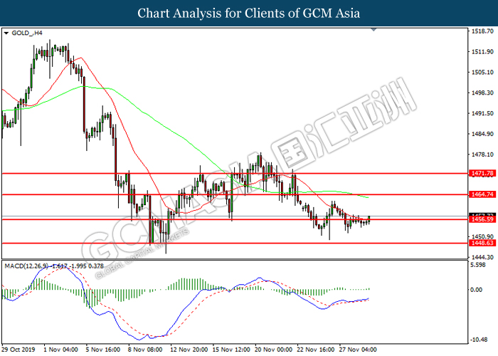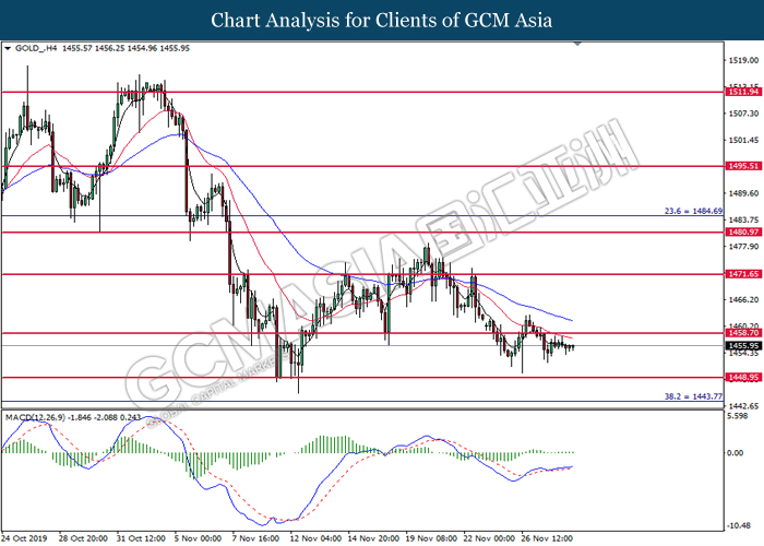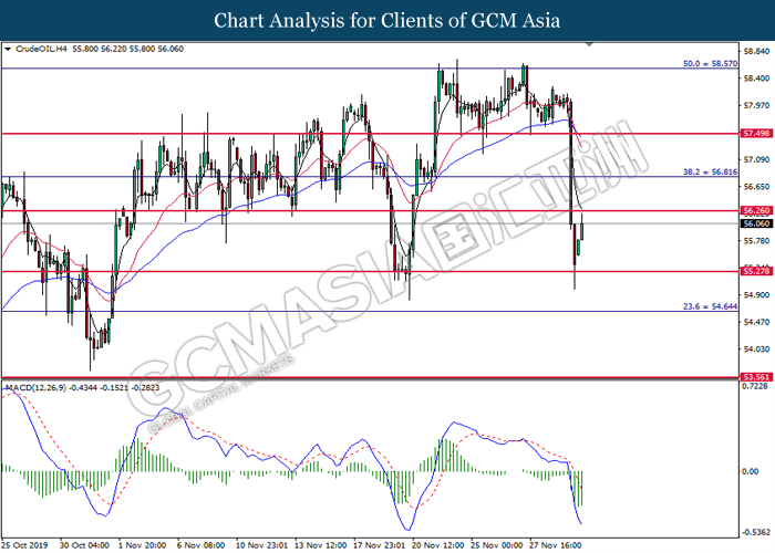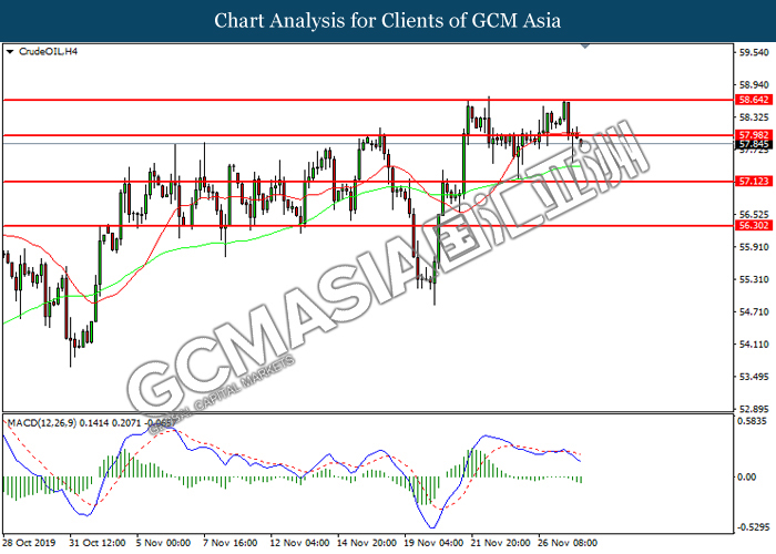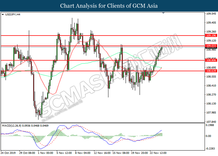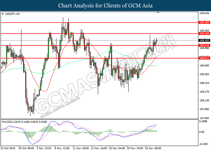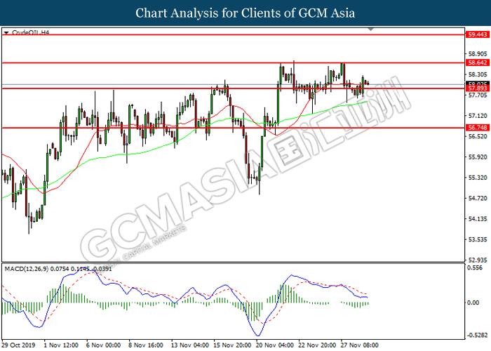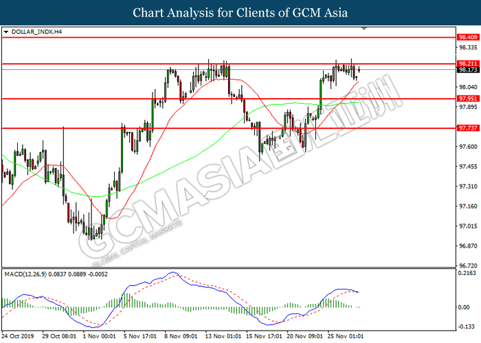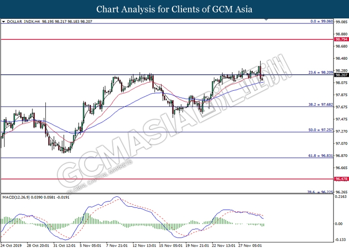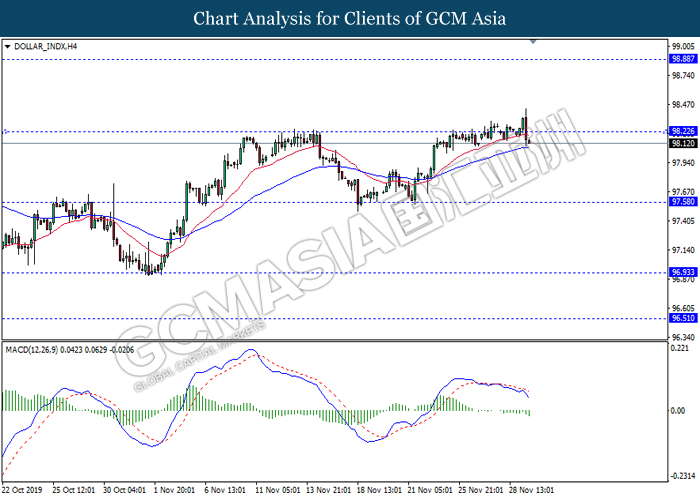 Dollar index which measured against a basket of six major rival pairs have slipped after reports of stalling progress in trade development. According to China Times, China is now insists that the the tariffs must be rolled back as part of the first-phase trade deal. President Trump’s negotiating team have stated that the China deal have been “stalled because of Hong Kong legislation”. The news have since worsen the sentiment and may derail any progress on further trade talk while the next batch of U.S tariff on Chinese goods will be kick off on Dec 15. As market are slowly back from last week’s Thanksgiving holiday, investors will continue to remain focus for further catalyst to gauge market sentiment. At the time of writing, dollar index fell 0.05% to 98.12 as of writing.