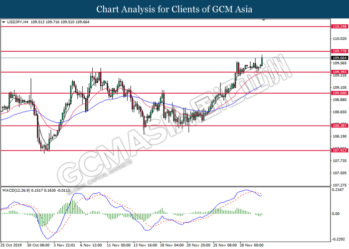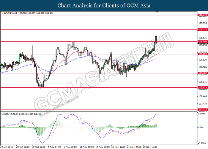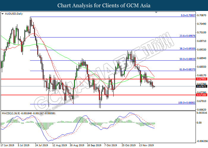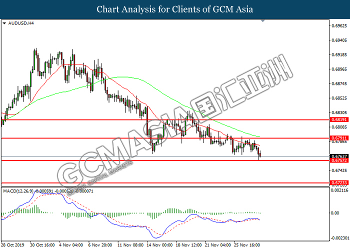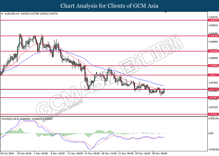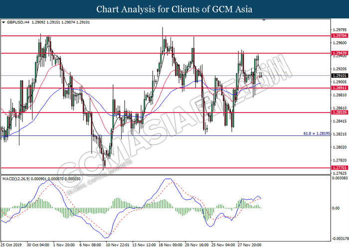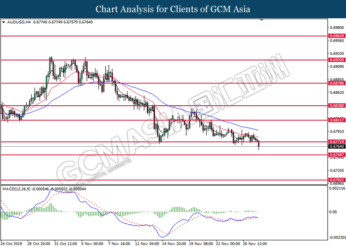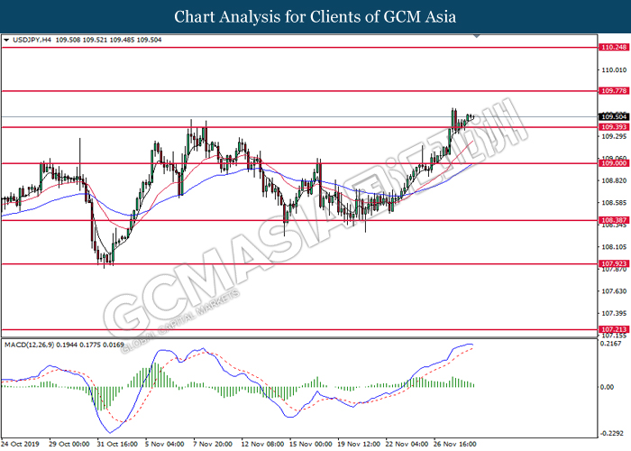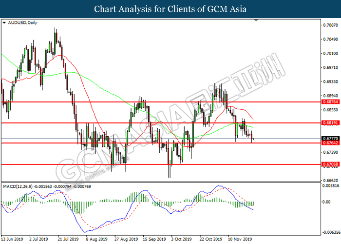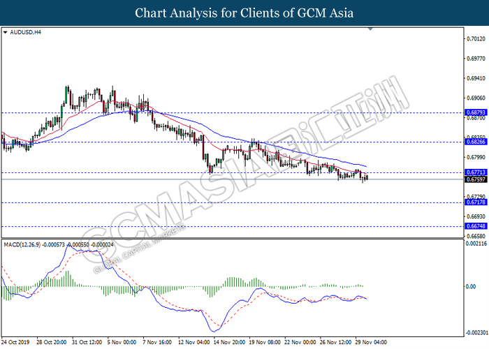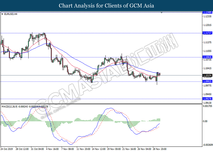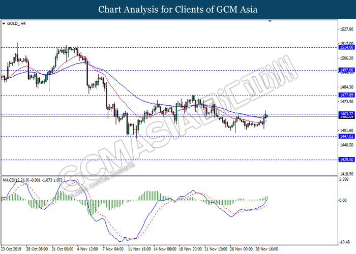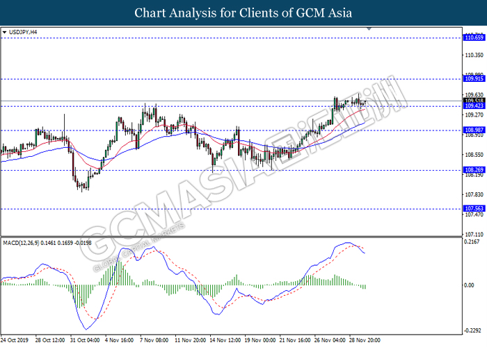 Dollar index which measured against a basket of six major rival pairs have slipped after reports of stalling progress in trade development. According to China Times, China is now insists that the the tariffs must be rolled back as part of the first-phase trade deal. President Trump’s negotiating team have stated that the China deal have been “stalled because of Hong Kong legislation”. The news have since worsen the sentiment and may derail any progress on further trade talk while the next batch of U.S tariff on Chinese goods will be kick off on Dec 15. As market are slowly back from last week’s Thanksgiving holiday, investors will continue to remain focus for further catalyst to gauge market sentiment. At the time of writing, dollar index fell 0.05% to 98.12 as of writing.