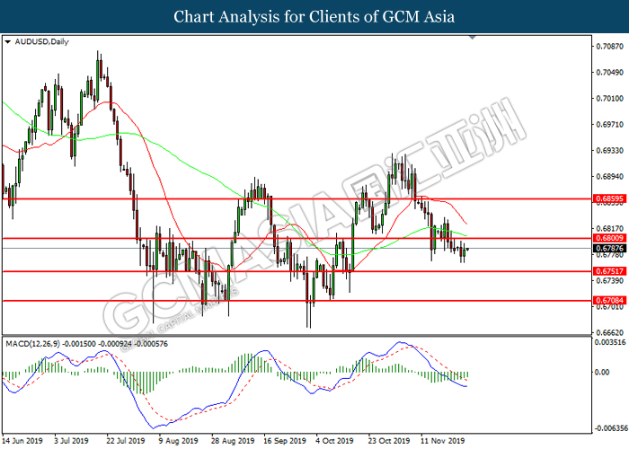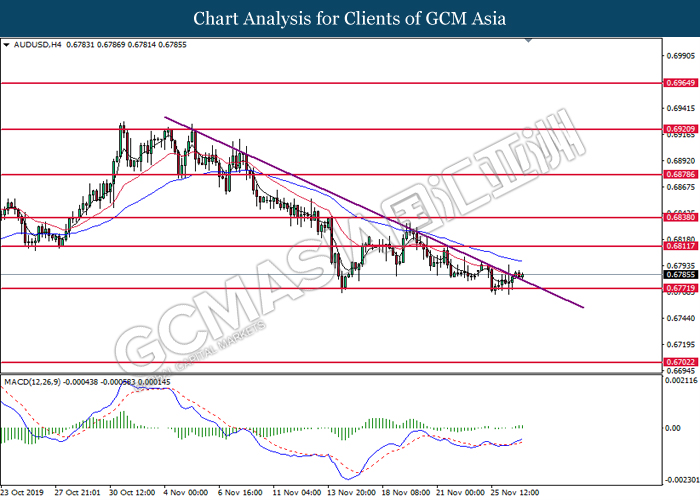 AUDUSD, H4: AUDUSD was traded higher following prior rebound from 0.6780. MACD which illustrate diminished downward momentum suggests the pair to be traded higher in short-term as technical correction.