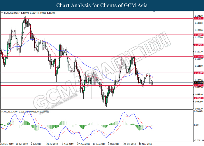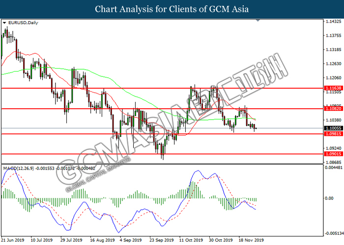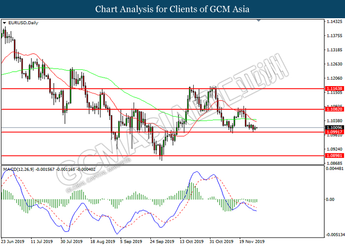 EURUSD, Daily: EURUSD was traded lower while currently testing the support level at 1.0990. However, MACD which illustrate diminishing bearish momentum suggest the pair to be traded higher in short-term as technical correction.