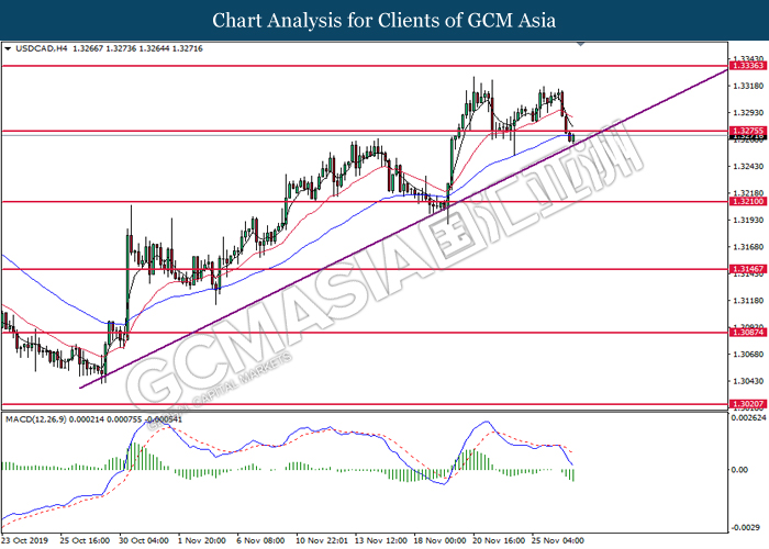 USDCAD, H4: USDCAD remains traded within an ascending channel formation. MACD which shows diminishing downward momentum suggests the pair to be traded higher, towards the direction of 1.3340.