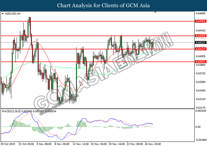 NZDUSD, H4: NZDUSD was traded flat near the resistance level 0.6435. However, MACD which illustrate diminishing bullish momentum suggest the pair to be traded higher after it breaks above the resistance level.