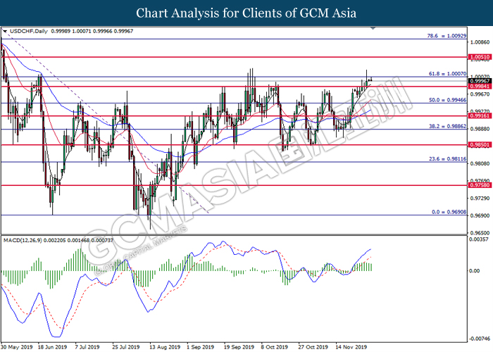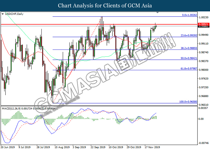 USDCHF, Daily: USDCHF was traded higher while currently testing the resistance level at 1.0005. However, MACD which illustrate diminishing bullish momentum suggest the pair to be traded lower in short term toward the support level at 0.9985.