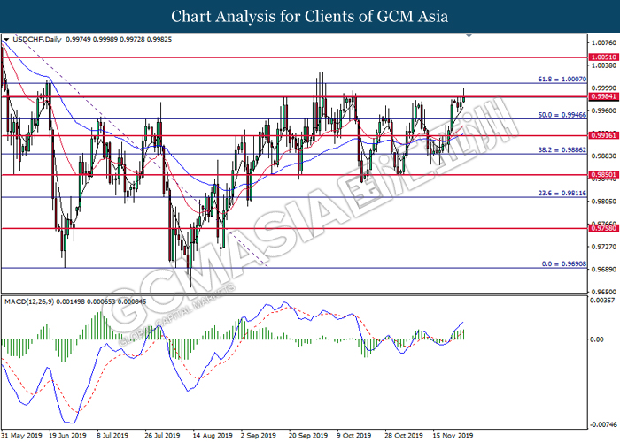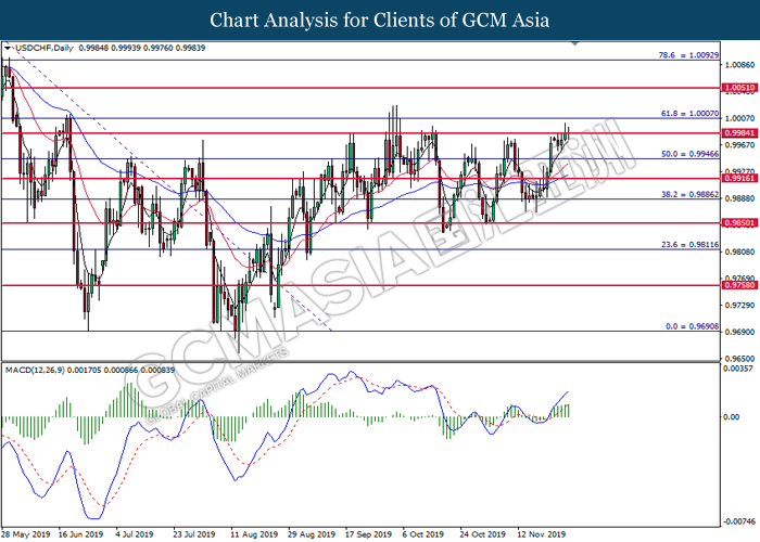USDCHF, H4: USDCHF was traded higher following prior closure above 0.9965. MACD which illustrate bullish signal suggests the pair to advance further up, towards the direction of 1.0000.