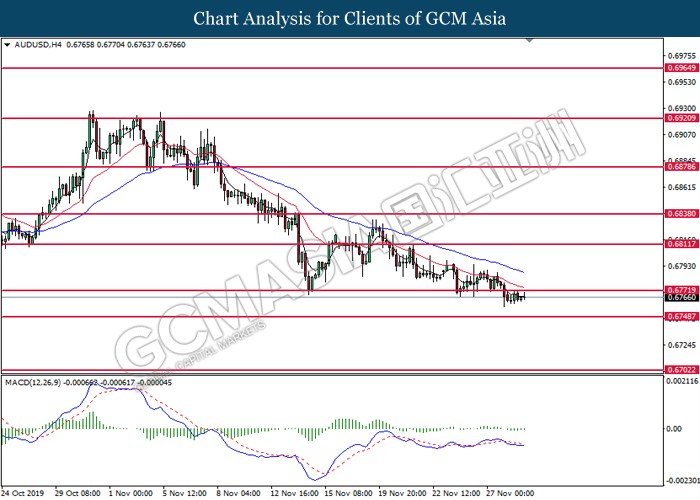 AUDUSD, H4: AUDUSD was traded higher while currently testing the resistance level at 0.6770. Due to lack of signal from MACD, it is suggested to wait for further confirmation such as breakout above or retracement before entering the market.