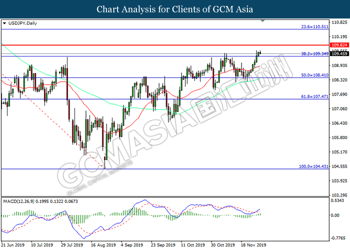 USDJPY, Daily: USDJPY was traded higher following prior breakout above the previous resistance level at 109.35. MACD which illustrated increasing bullish momentum suggest the pair to extend its gains toward resistance level at 109.80.