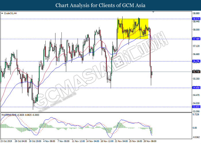 CrudeOIL, H4: Crude oil price was lower following prior breakout below the support level 56.30. MACD which illustrate bearish momentum signal suggest the commodity to extend its losses towards the support level 54.85.