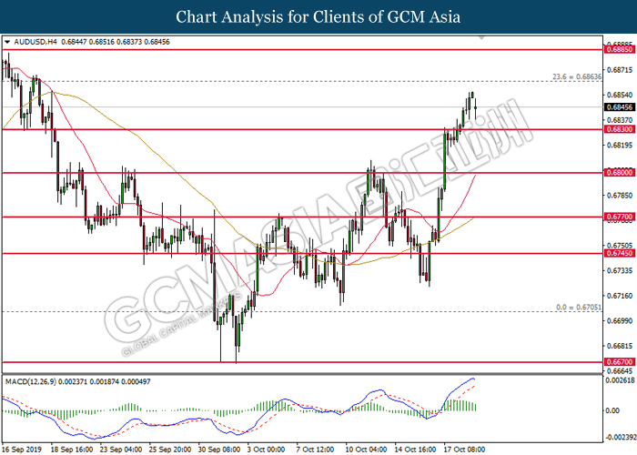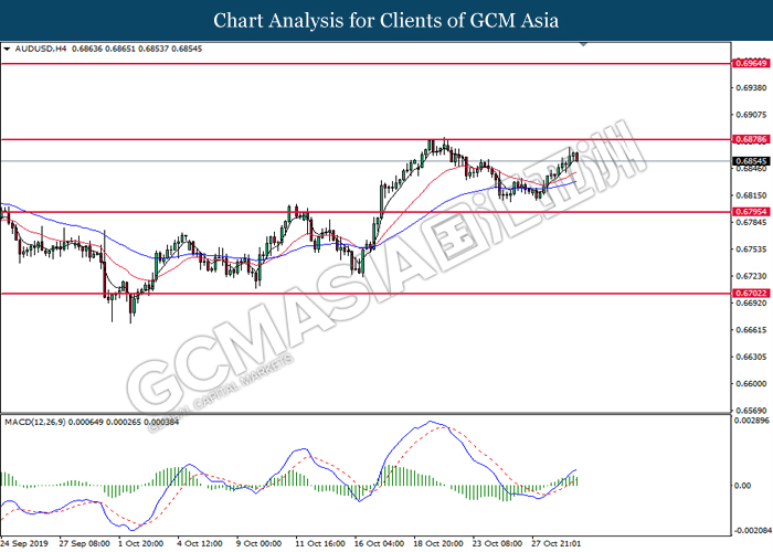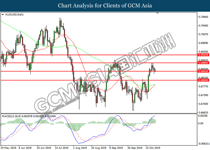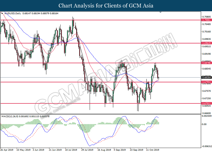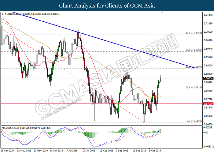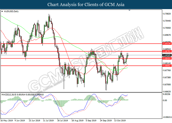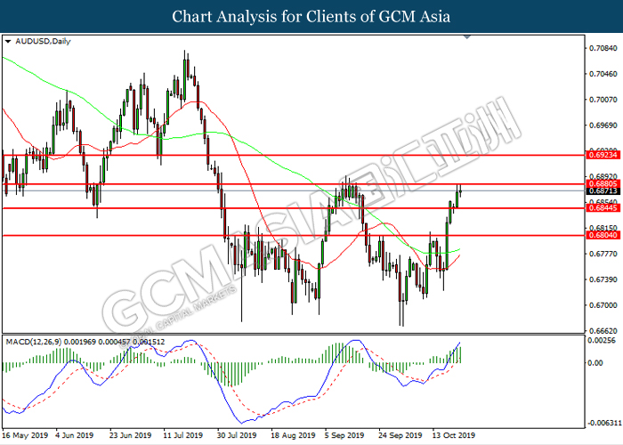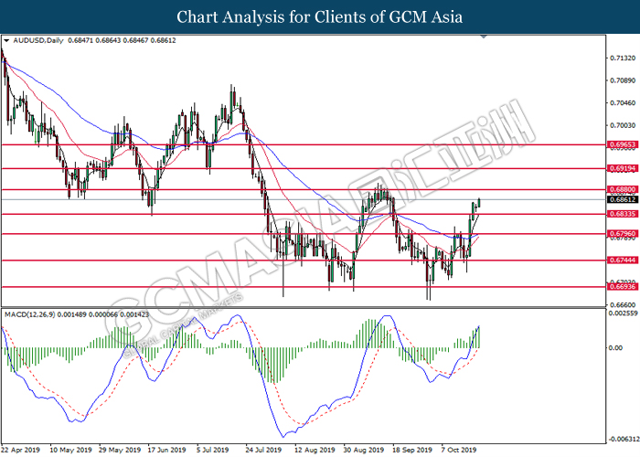 AUDUSD, Daily: AUDUSD was traded higher while currently testing the resistance level at 0.6880. MACD which illustrated increasing bullish momentum suggest the pair to extend its gain after it successfully breakout above the resistance level.