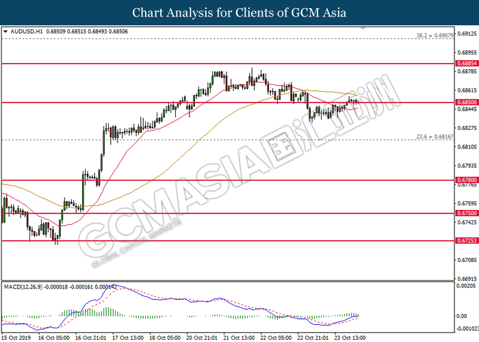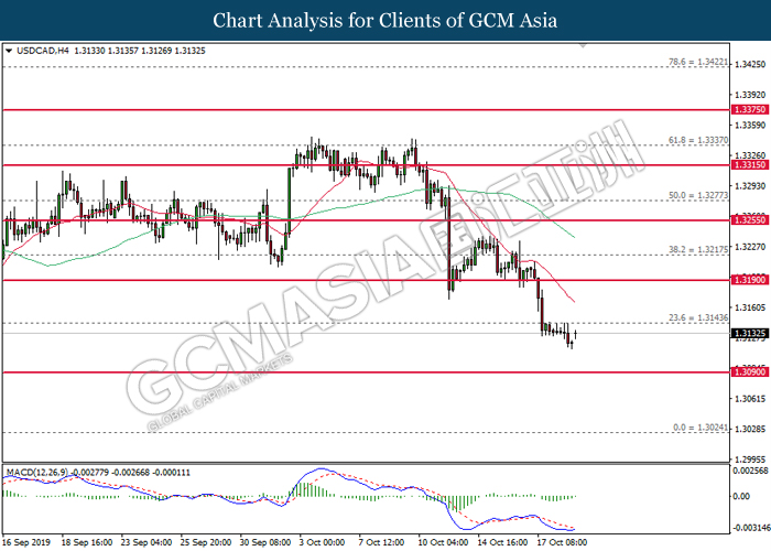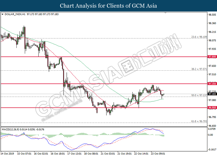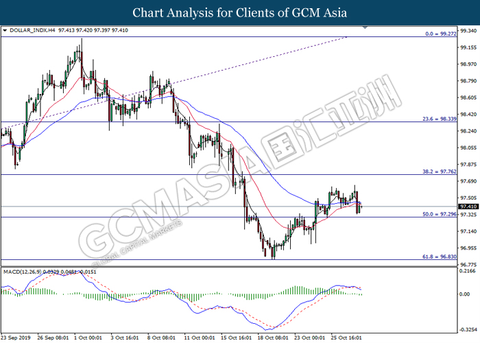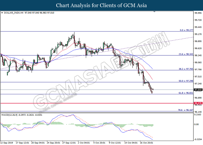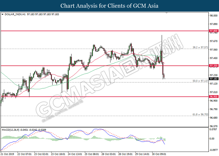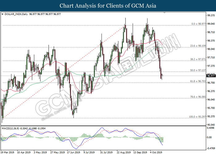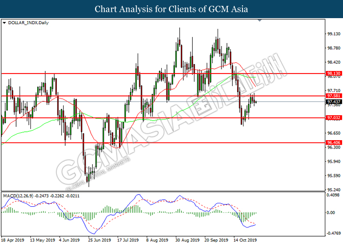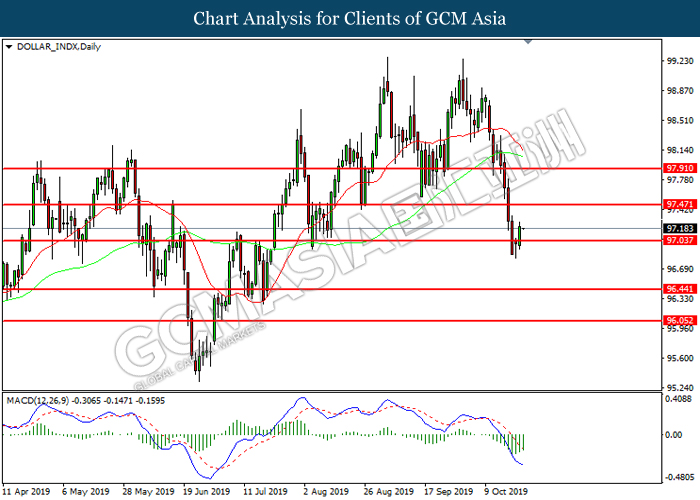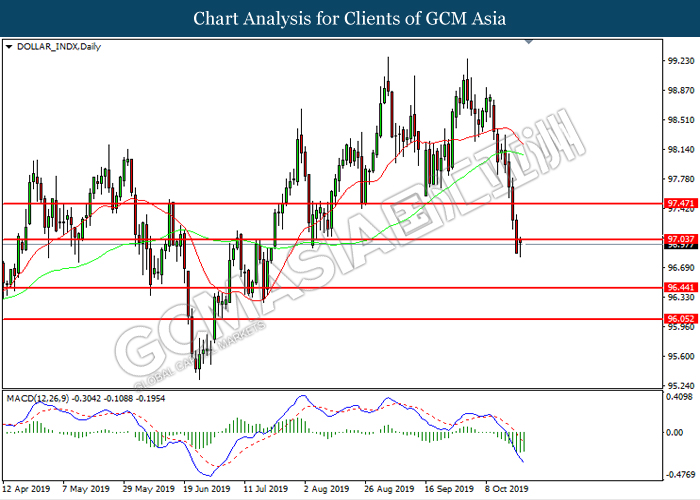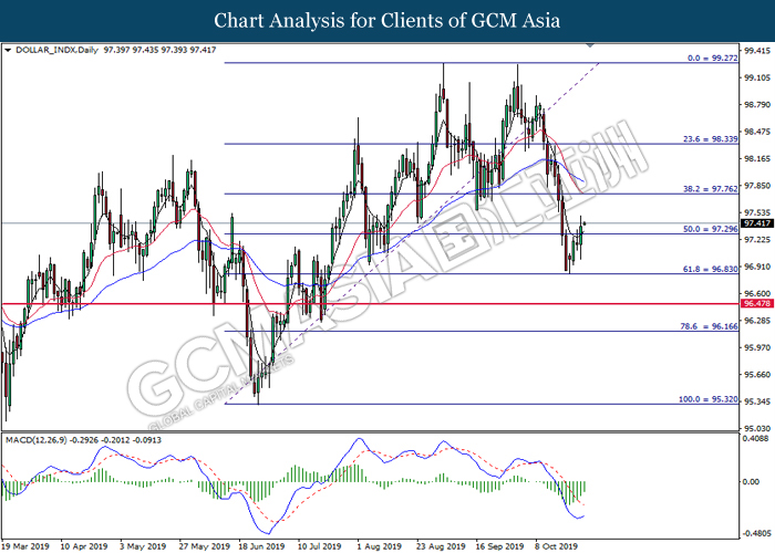 Dollar index which measure its value against a basket of six major currencies hovered in a tight range while investors anticipate US Central Bank to initiate another rate cut of 0.25% before the end of year 2019. So far, recent US data such as Retail Sales and Philadelphia Manufacturing Index showed unexpectedly drop in reading as compare to economist forecast, which provides signals toward Fed member to have third rate cut in this year in order to support the economy growth. According to Fed Rate Monitor Tool, the probability of 0.25% rate cut rose to 90.9% compared to last week at 67.3%, hiking in investor’s expectations on rate cut sentiment. However, it is still unclear whether overall Federal Reserve members are tilt dovish or hawkish as recent trade war dispute between US and China eased. US has delayed their new round of tariff against China, while China in return will purchase even more agriculture products from US local farmers. Therefore, Fed will continue eye on more economic data and news from trade war in order to scrutinize their future step on monetary policy. Dollar index inched up 0.07% to 97.00 during Asian trading session.