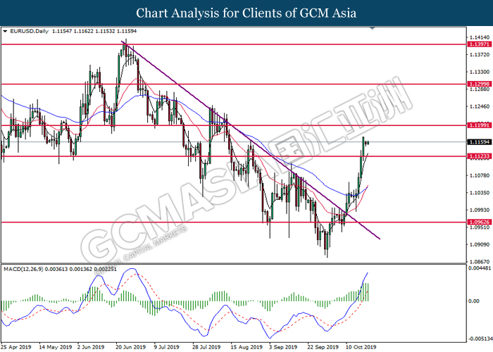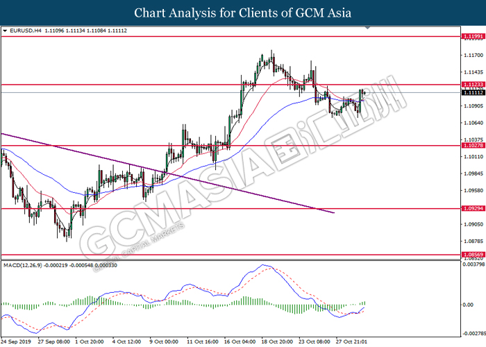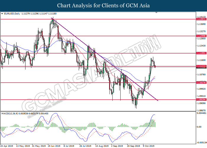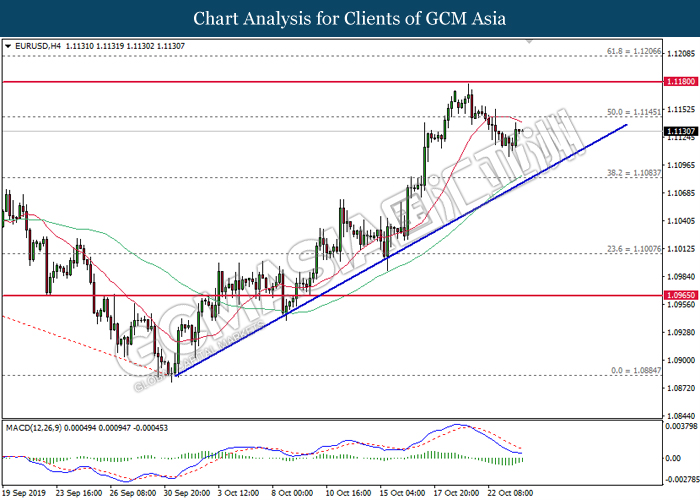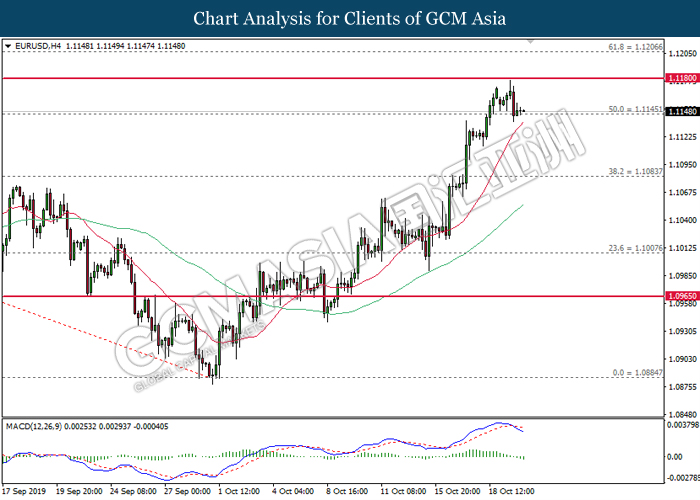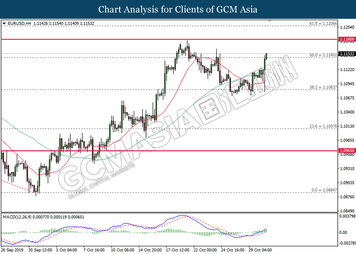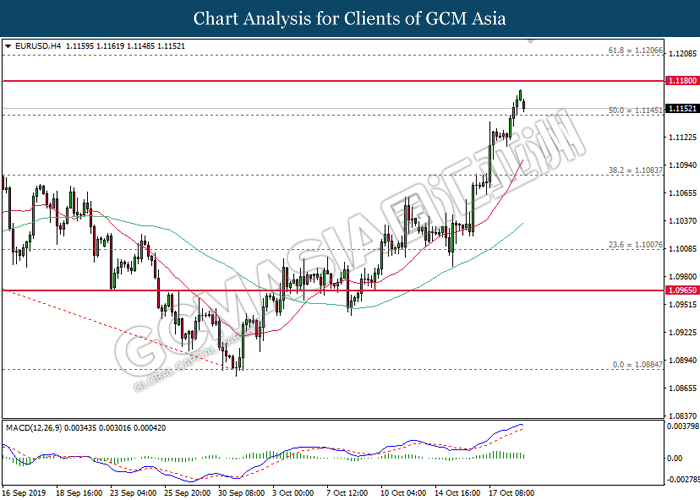 EURUSD, H4: EURUSD was traded higher following prior rebound from the lower level. MACD which illustrate bullish signal suggest the pair to extend its gains, towards the direction of 1.1180.