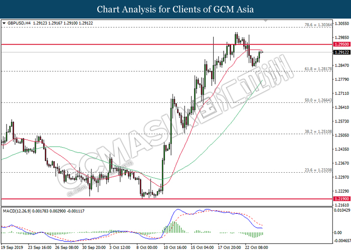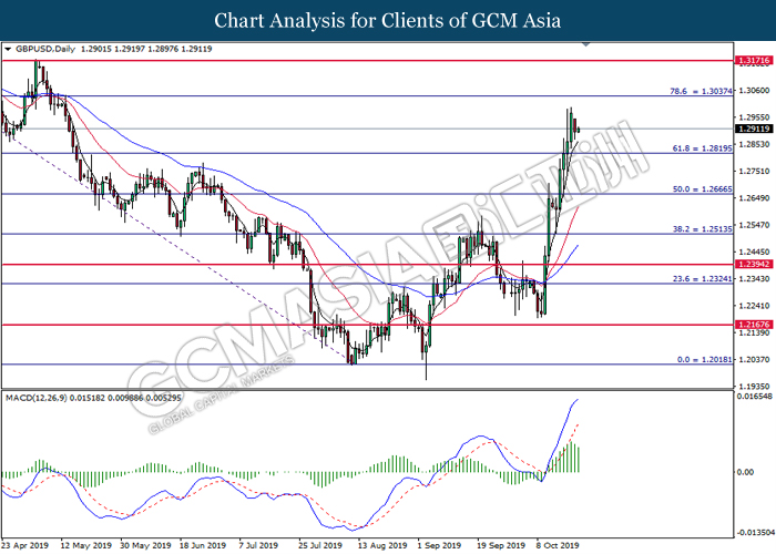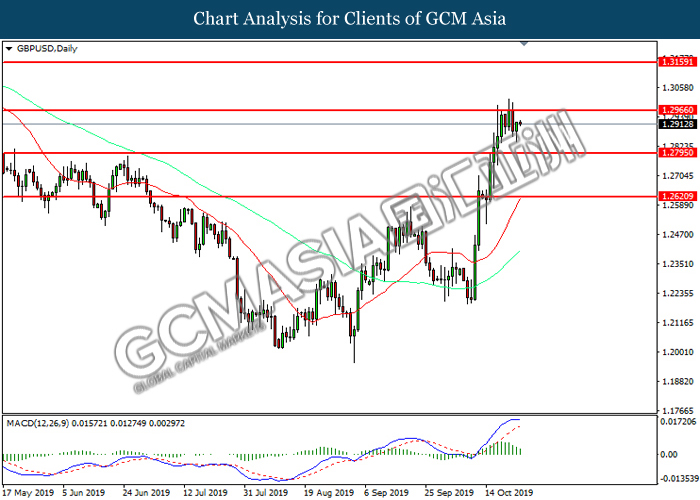 GBPUSD, Daily: GBPUSD was traded higher following prior breakout above the previous resistance level at 1.2915. However, MACD which illustrated diminishing bullish momentum suggest the pair to be traded lower in short-term as technical correction.