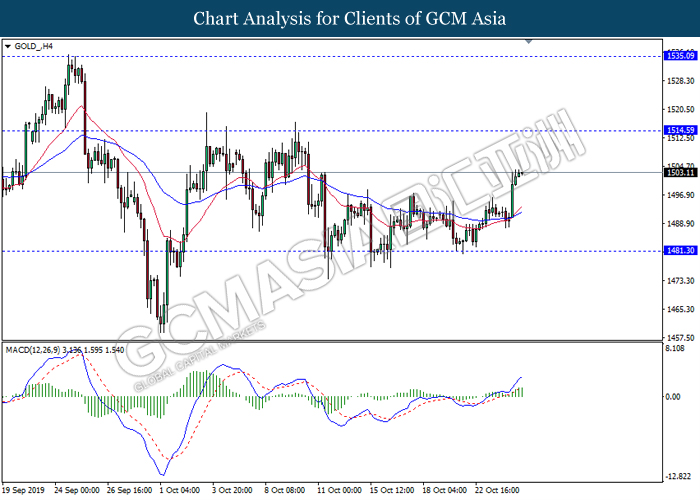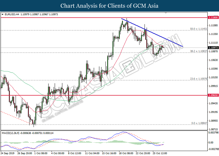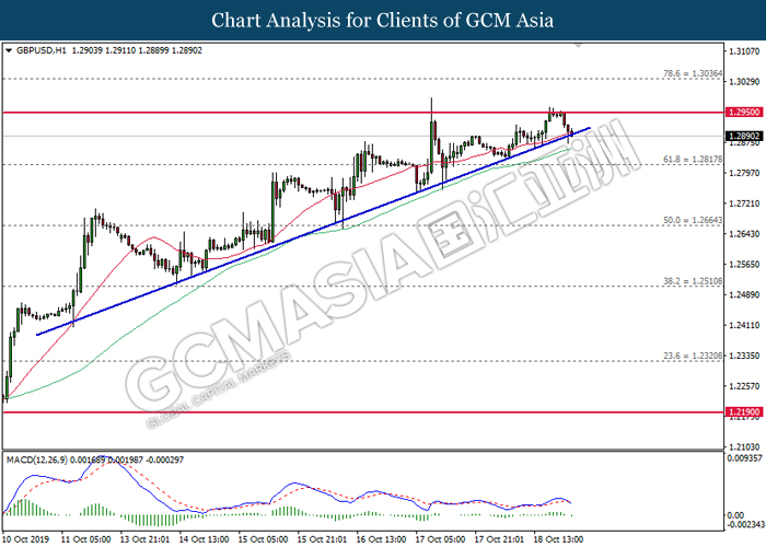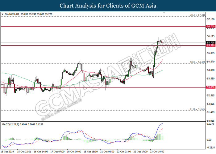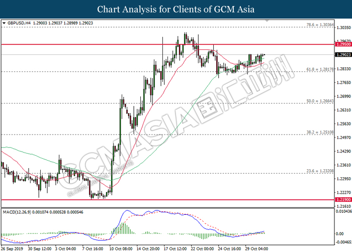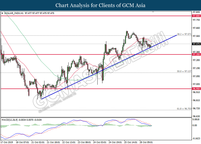 Dollar index which gauge its value against a basket of six major currencies slumped after recent news showed that Trump administration unwilling and maybe unable to achieve the phase 1 trade deal in upcoming meeting between both premiers in Chile. Despite, US government revealed that the progress on solving the issue of trade deal is still good, if the deal may not be signed on November meeting, it does not mean the deal will be broken. On the other side, mixed economic data from US region also drove the greenback’s direction unclear. According to the economic data, US CB Consumer Confidence data came in at 125.9, missing the forecast of economist at 128.0 while hinting consumers are pessimistic toward the economy growth outlook. However, upbeat result of Pending Home Sales data lifted up the appeal of dollar as it been reported at 1.5%, unexpectedly higher than economist forecast at 0.9%. Dollar index inched down 0.08% to 97.40 during Asian early trading session. On the other hand, the pair of GBP/USD quoted up 0.01% to 1.2865 while remained as the hottest trading pair in forex market. Under the support from Labour party, UK Prime Minister Boris Johnson managed to win in a vote on requesting a general election during the season of winter, December 12. In the voting, the house of common has approved the legislation paving the way for the first general election since year 1923 by the margin of 438 votes to 20, with an intention to solve the Brexit deadlock as early as possible.