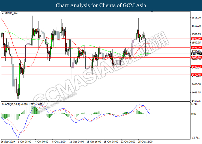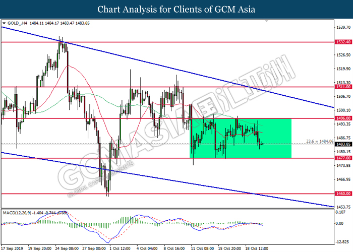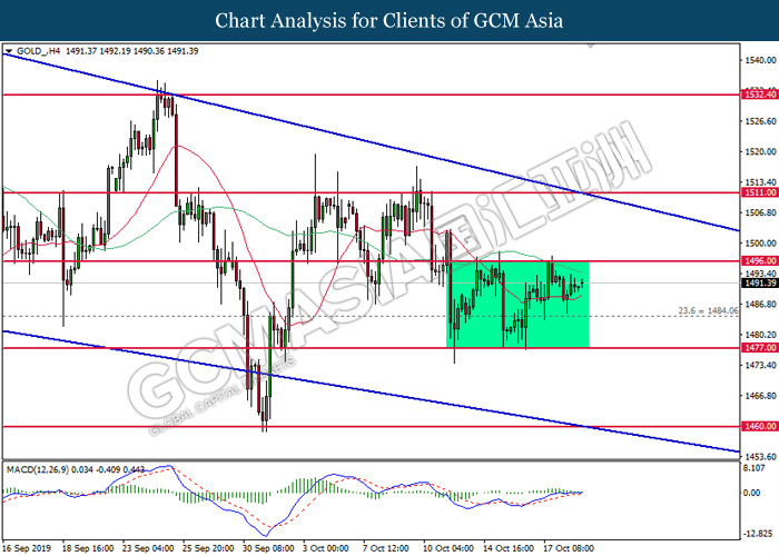 In the commodities market, crude oil price slumped 0.17% to $53.38 per barrel. Oil prices continues to oscillate within a tight range as traders waits for more signals with regards to trade war and US inventories data. On the other hand, gold price was traded flat near $1,484.36 a troy ounce as traders monitor further developments with regards to Brexit and US-China trade negotiation.