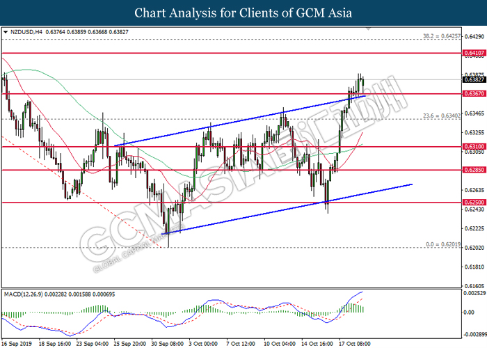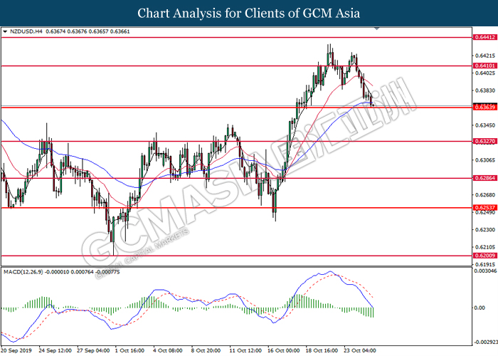 NZDUSD, H4: NZDUSD was traded higher following prior breakout above the previous resistance level at 0.6385. However, MACD which illustrated diminishing bullish momentum suggest the pair to be traded lower in short-term as technical correction.