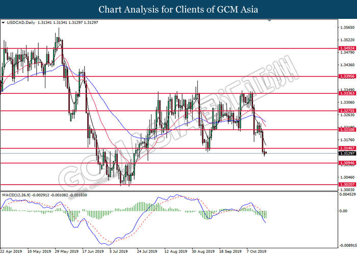 USDCAD, Daily: USDCAD was traded lower following prior breakout below the previous support level at 1.3145. MACD which illustrate persistent downward momentum suggests the pair to extend its losses toward the support level at 1.3095.