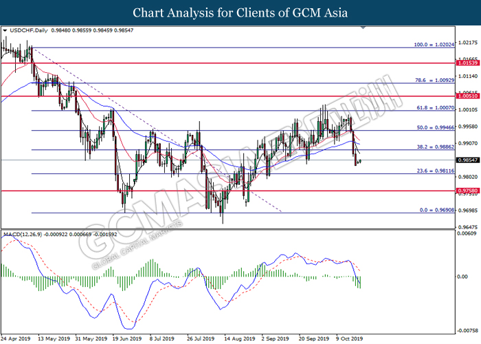 USDCHF, Daily: USDCHF was traded higher following prior rebound from the lower levels. MACD which illustrate diminished downward momentum suggests the pair to extend its rebound toward the resistance level at 0.9885.