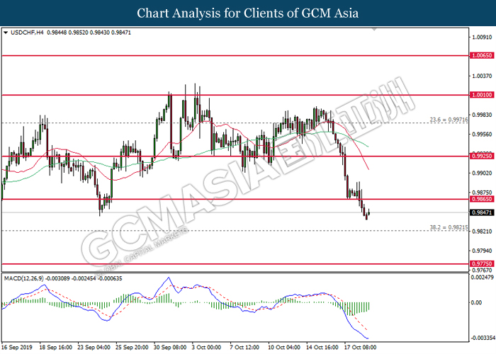 USDCHF, H4: USDCHF was traded lower following prior closure below 0.9925. MACD which illustrate bearish signal suggests the pair to extend its losses, towards the direction of 0.9865.
