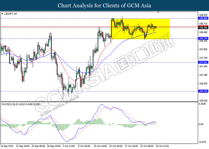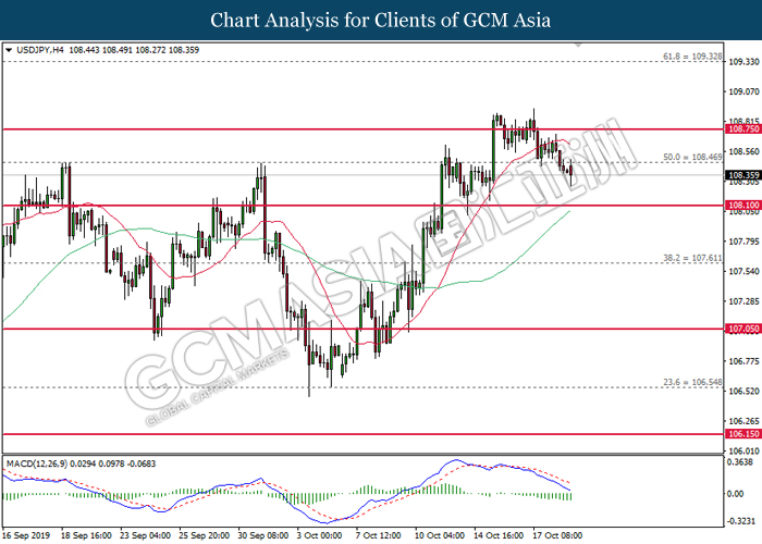 USDJPY, H4: USDJPY was traded lower following prior retracement from 108.75. MACD which illustrate bearish signal suggests the pair to extend its losses, towards the direction of 108.10.